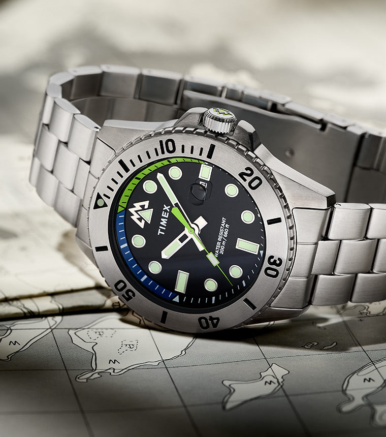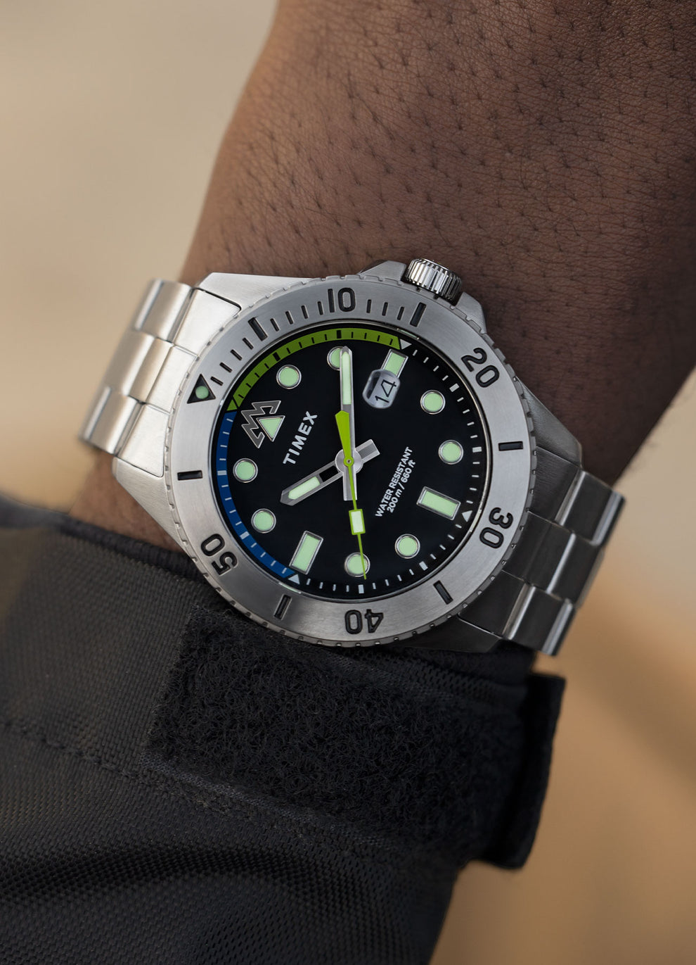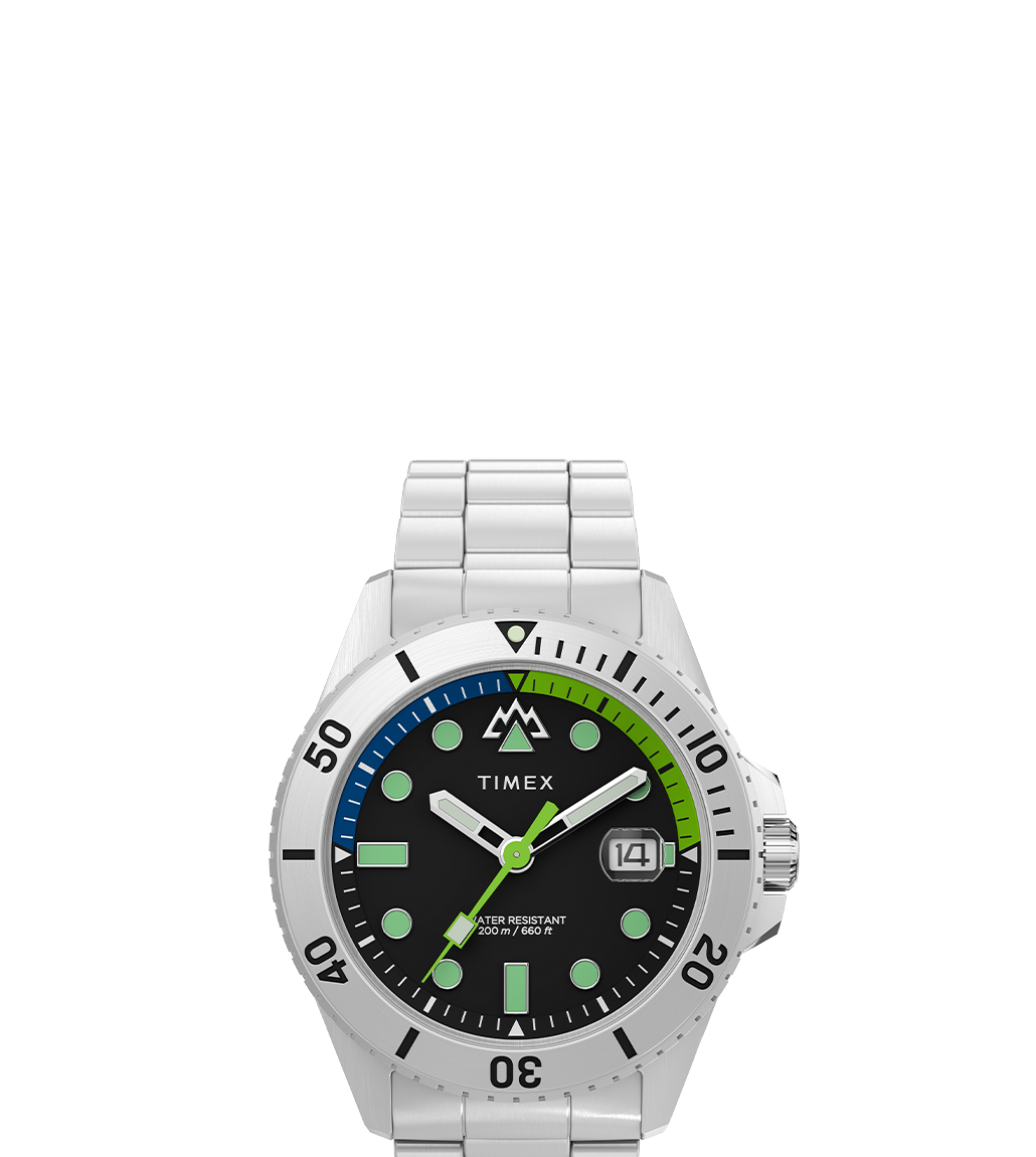 Our Anchorage brings a brand new 42mm stainless-steel case design to our rugged Expedition lineup. This watch boasts the authentic look of a true diver watch, with energizing blue and lime details; sizeable luminescent hour markers and hands; a scratch-resistant, anti-reflective sapphire crystal with date magnifier for enhanced viewing; and a unidirectional ratcheting bezel for tracking elapsed time. Opt for a more contemporary aesthetic with a corrosion-resistant stainless-steel bracelet.