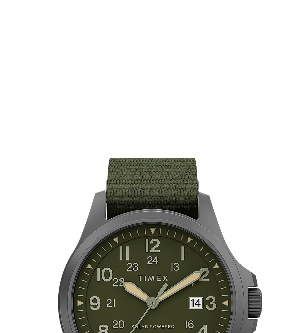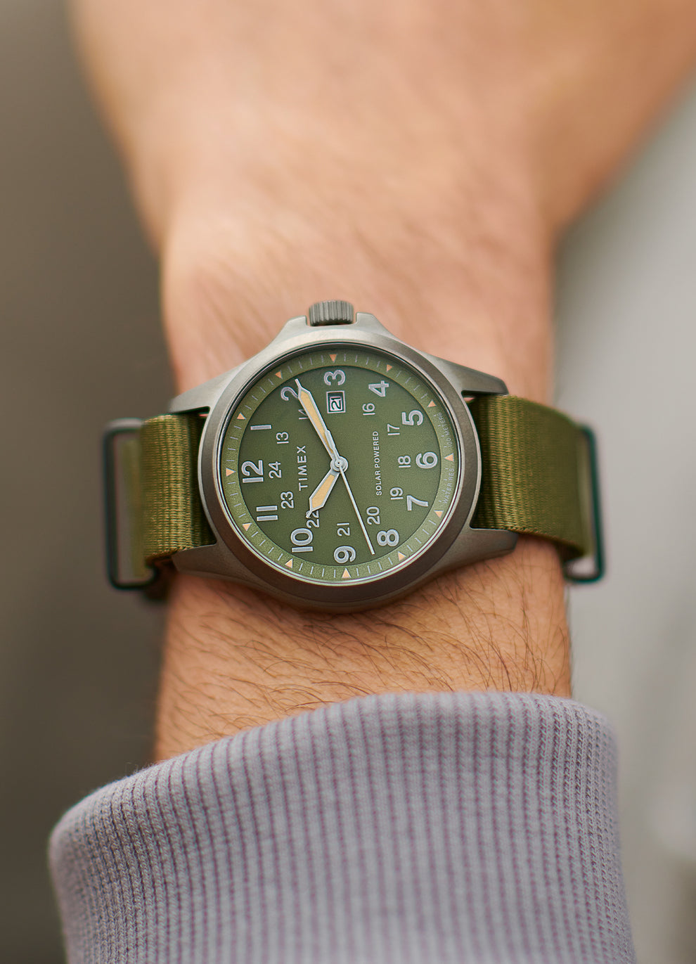 Featuring a solar-powered movement that lasts up to 4 months and eliminates the need for battery changes, our Field Post 41 Solar is a military-inspired outdoor watch made to accompany you anywhere. It also boasts an anti-reflective sapphire crystal, 100-meter water resistance rating and a screw-down case back and crown in a perfect 41mm case profile. And thanks to the luminescent hands and dial markings, the sun works overtime to make this watch legible in the dark. Equipped with a comfortable green fabric strap made from 100% recycled plastic and crafted to last — this watch can stay on your wrist all the way to the top.