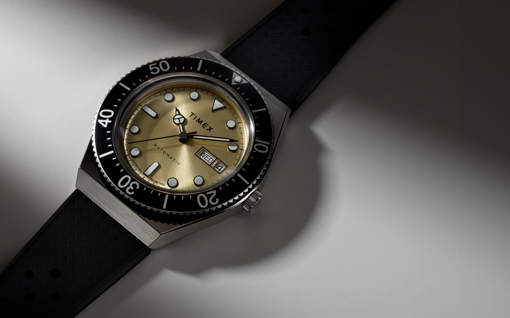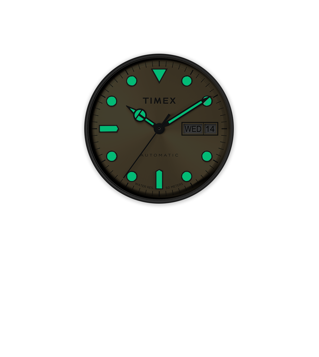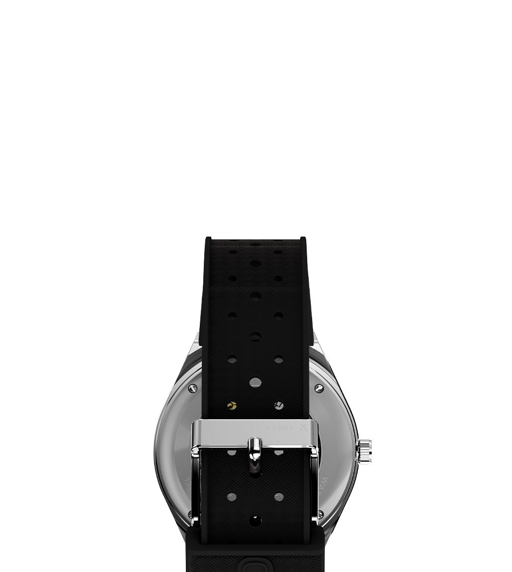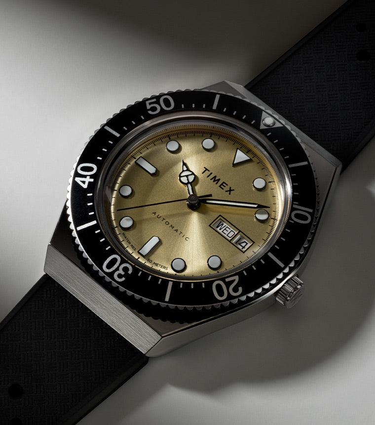Our M79 Automatic is something entirely new, even though it might look familiar. Inspired by the 1970s Q Timex® and elevated with a 21-jewel automatic movement, this watch is a fresh interpretation of a much-loved Timex icon. The 40-hour power reserve of its Japan-made, self-winding, automatic movement is energized by your motion and can also be wound manually by using the crown. We’ve updated it with a perforated and textured black synthetic rubber strap that offers an athletic style and soft-to-the-touch comfort. This watch also features a black unidirectional bezel, a deep champagne dial, luminous dial markings, sturdy 40mm stainless-steel case, day of the week and date window, and an exhibition case back, making it a modern timepiece that captures the bold spirit of an era that changed everything.