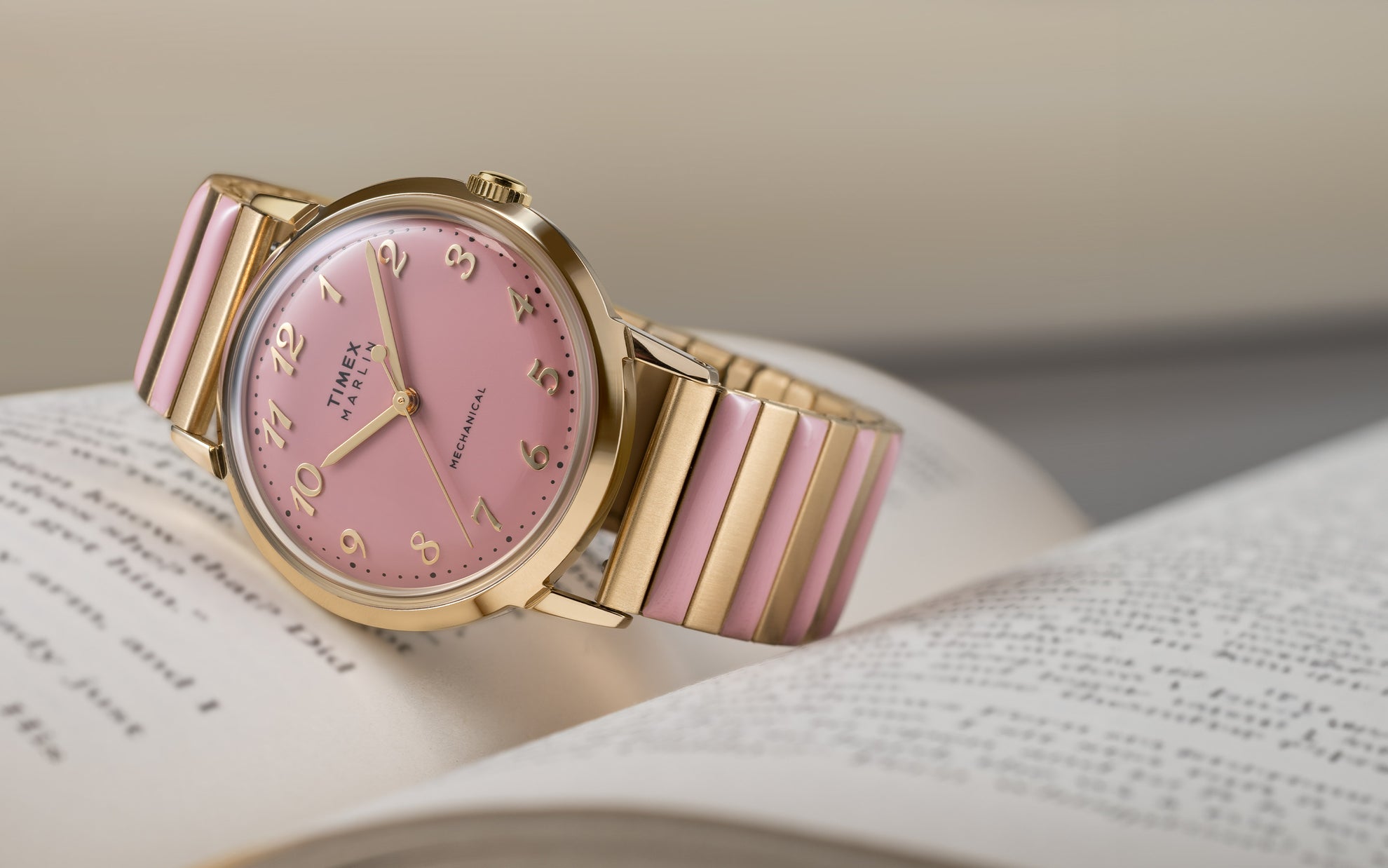 This watch offers a 34mm stainless-steel case that is both simple and elegant, providing the perfect frame for a pink dial featuring gold-tone Breguet numeral markers. The mechanical movement and domed acrylic crystal pay homage to classic watch styles of the past. Meanwhile, the Perfect Fit™ expansion band with alternating pink and gold-tone links can be sized perfectly to your wrist, no tools or jeweler necessary.Specifications