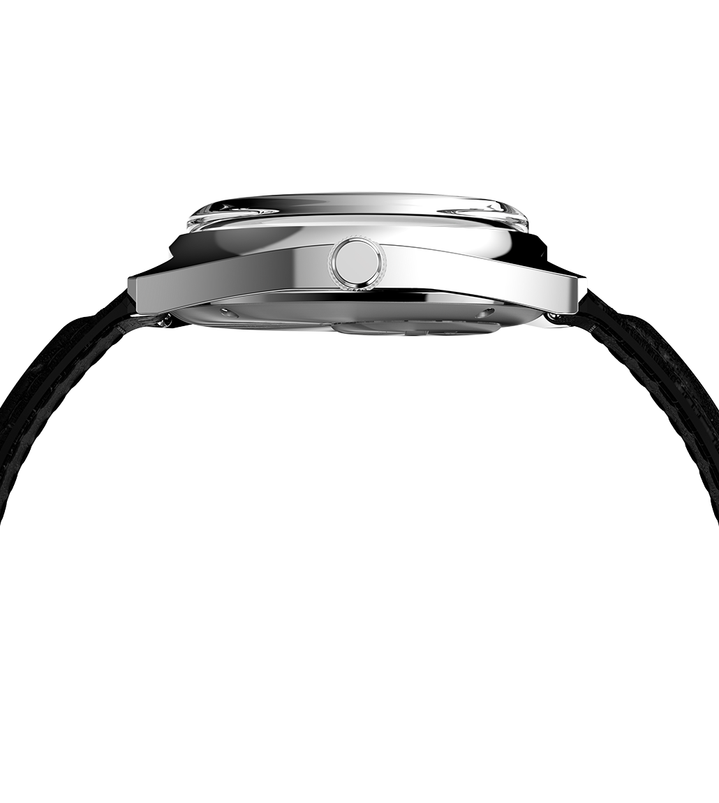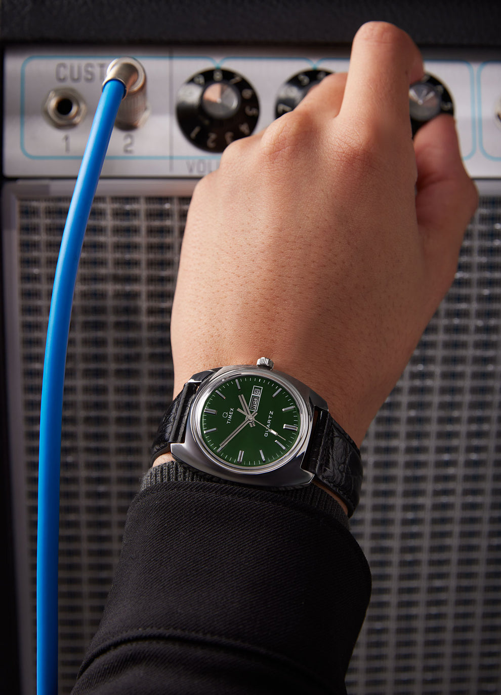 Our Q Timex 1978 is presented in a 37.5 mm stainless-steel case and crafted with all the features that make our collection of Q Timex Reissue watches so beloved–a reliable quartz movement, hand-applied indices, period-correct domed acrylic crystal, day of the week and date window, and a slim-yet-substantial retro case profile–but now with a brilliant, deep green dial and a glossy black crocodile patterned natural leather strap. This throwback dress watch draws upon California cool and an era of wristwatch design that changed everything.