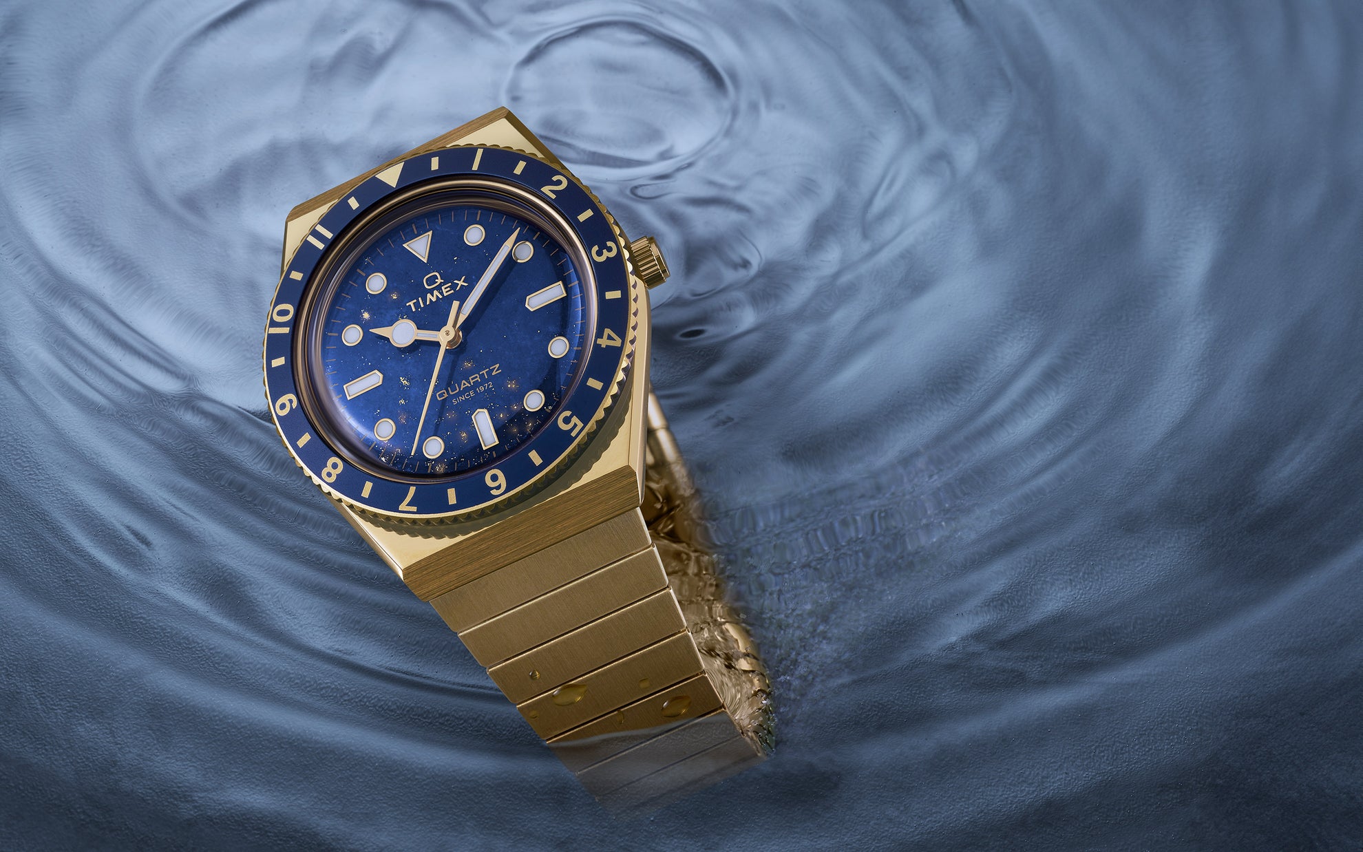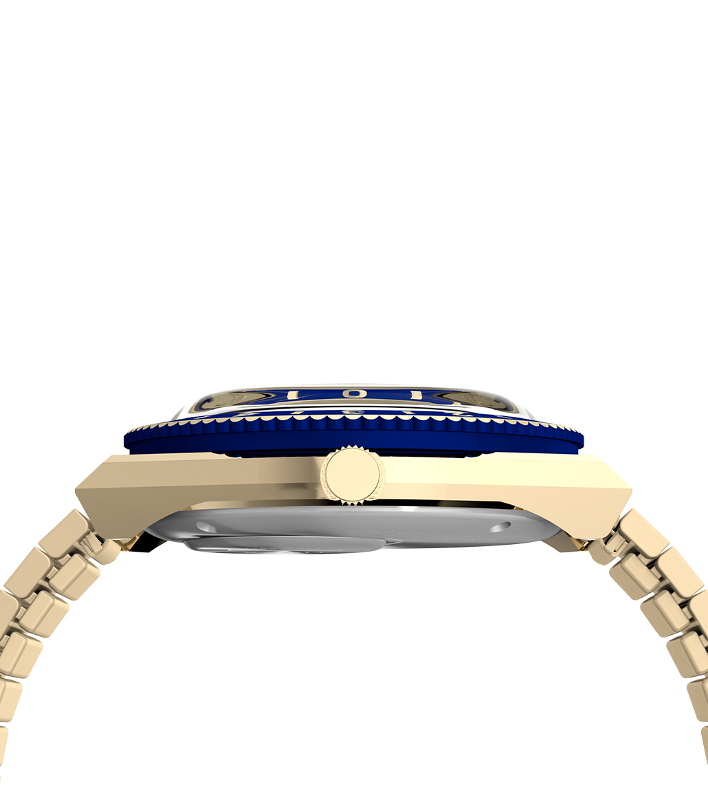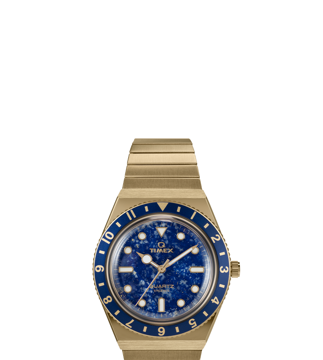 Our Women’s Q Timex brings the healing energy of the earth to your everyday look with brilliant blue lapis lazuli stone dial. Believed to cleanse the body of stress and promote spiritual growth, natural lapis lazuli features a deep blue coloring—often with flecks of golden pyrite—that makes each dial as one-of-a-kind as you. The brushed and polished 36mm gold-tone stainless-steel case is accented with a navy bezel that beautifully complements the rich, earthy tones of the dial, and we’ve paired this beauty with our Perfect Fit stainless-steel expansion band for a hassle-free, custom fit. Echoing the heritage of our original Q Timex 1979 Reissue, this timepiece also boasts iconic features like a rotating bezel, functional battery hatch, and domed acrylic crystal.