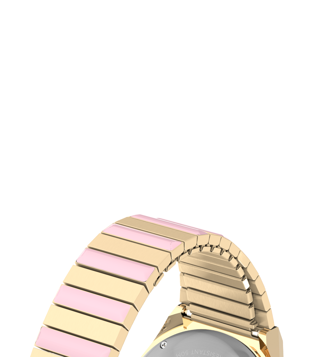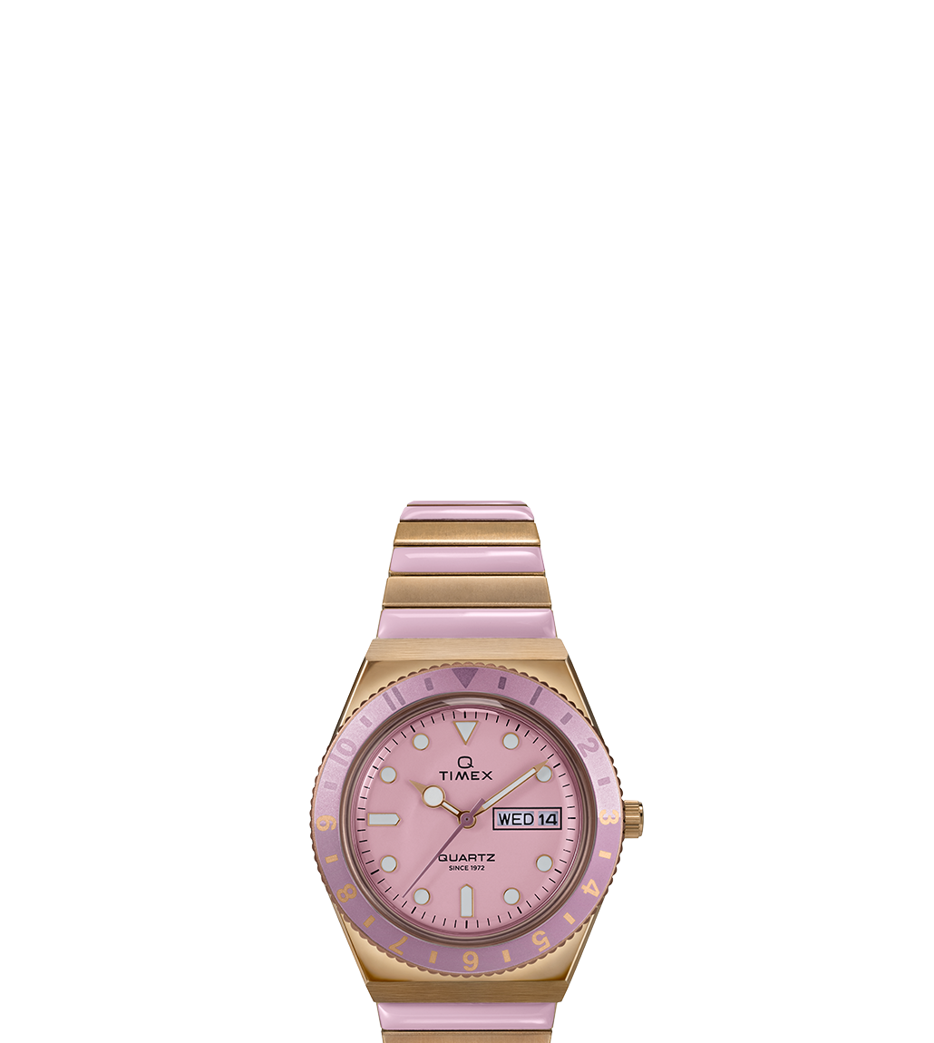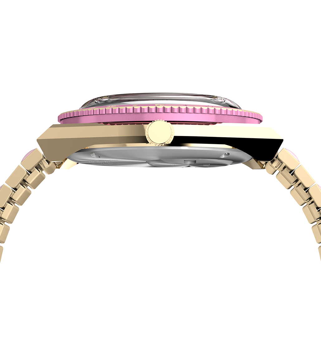 This fresh update to our Women’s Q Timex features a soft pastel colorway, with the dial, bezel, and brushed gold-tone stainless-steel Perfect Fit expansion band featuring sweet shades of pink. Other details include all you’d expect from our Q – a bidirectional rotating top ring, day of the week and date window, bold hour markers, and domed acrylic crystal.