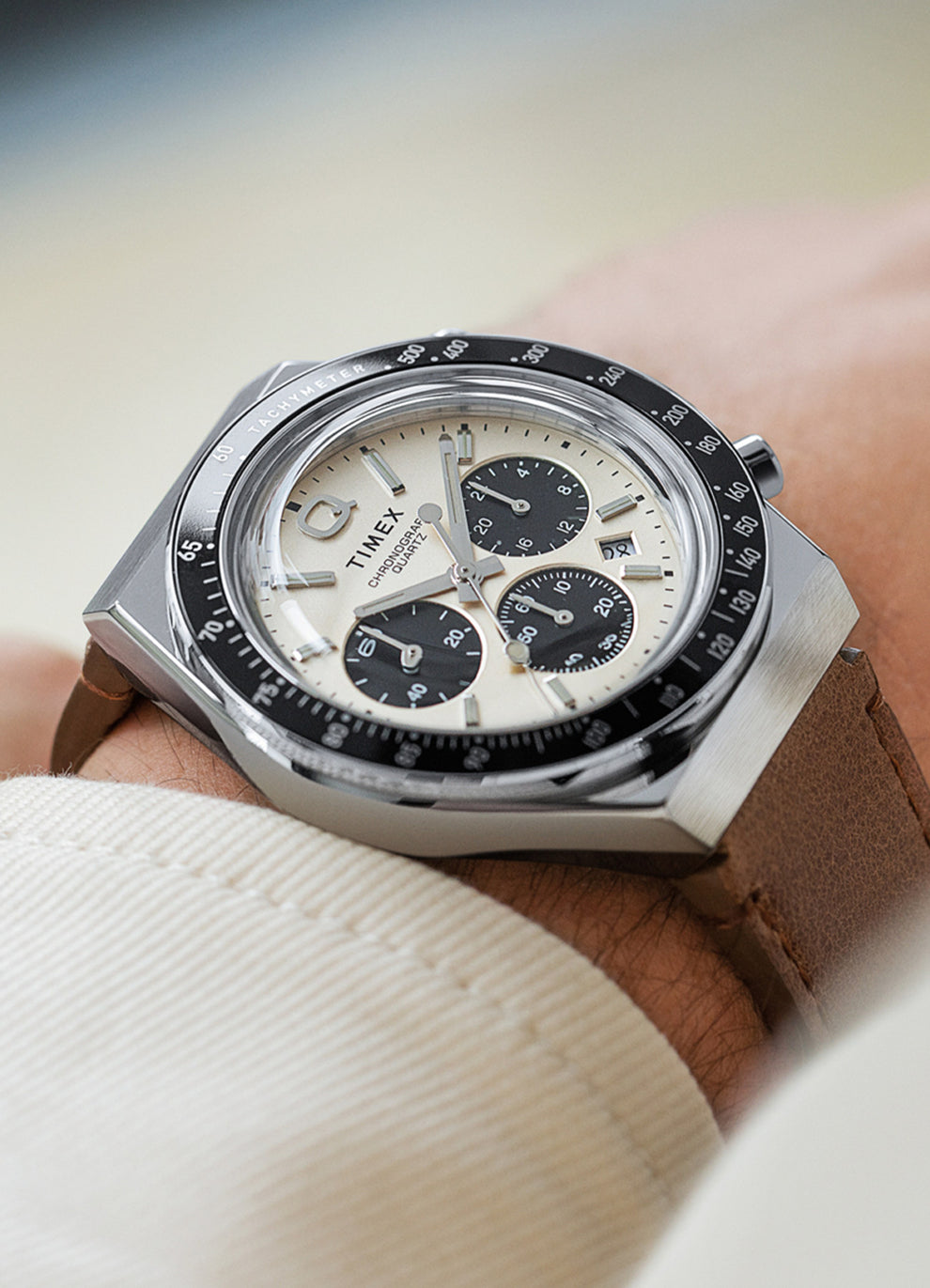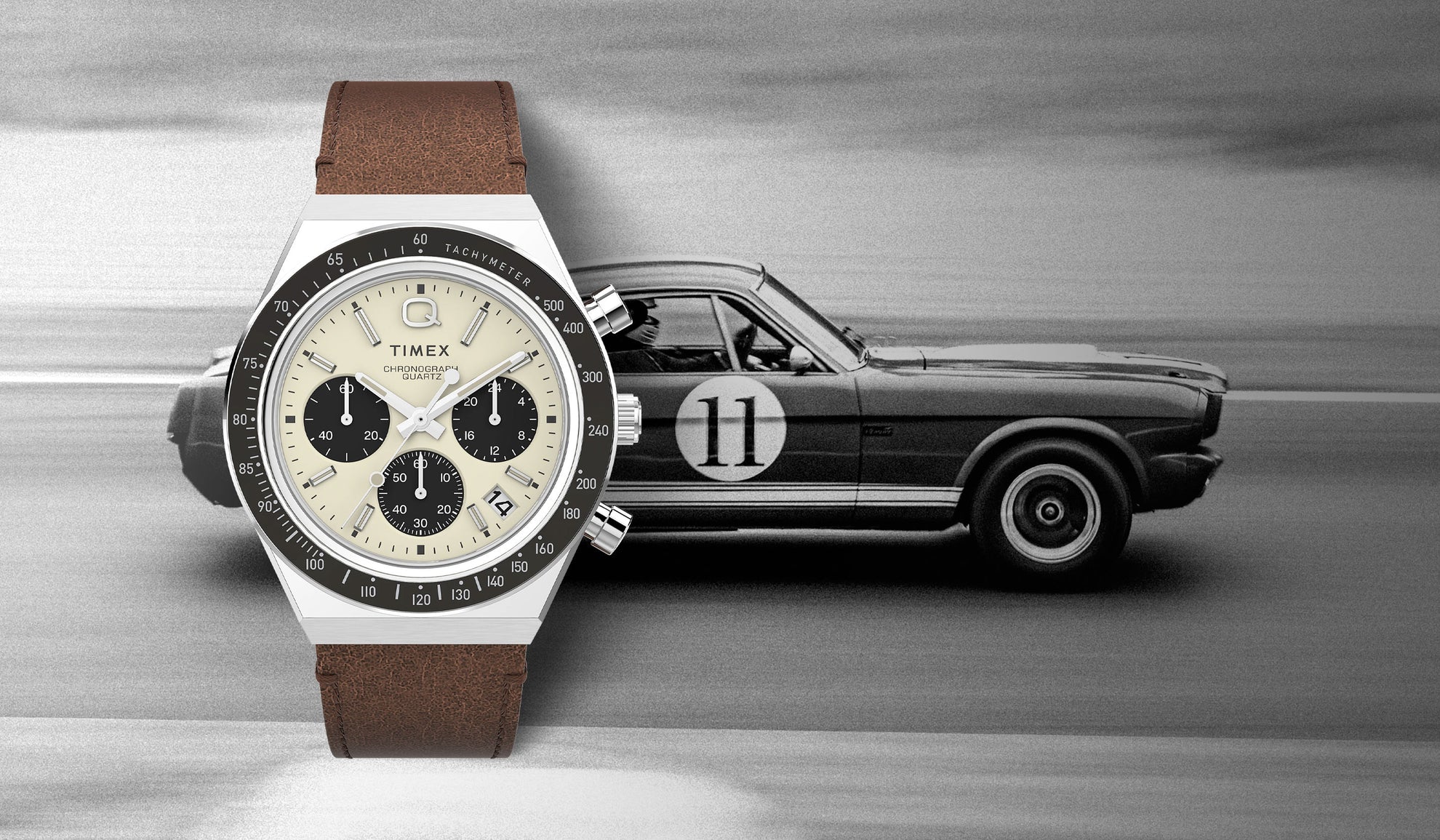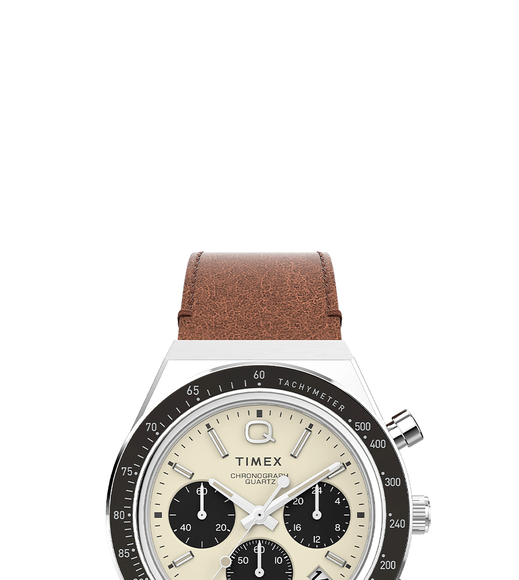 Roar across the finish line with our high-performing Q Timex Chronograph. Inspired by the original motoring watches that graced the tracks of Europe’s most iconic races, this timepiece celebrates the endurance of our legendary 1970s Q Timex. An ultra-precise chronograph movement and black tachymeter bezel recreate the finesse and function of a true racing watch, allowing you to determine elapsed time and average speed like the greatest daredevils in motorsports. Contrasting sub-dials, a date feature, hand-applied dimensional indices, and an updated Q Timex logo smolder against a cream dial, while a brushed and polished stainless-steel case and crown bring dynamism and durability to its retro construction. Infinitely wearable, a brown leather strap with quick-release spring bars makes for a sporty presentation that’s ready to hit the road whenever you are.