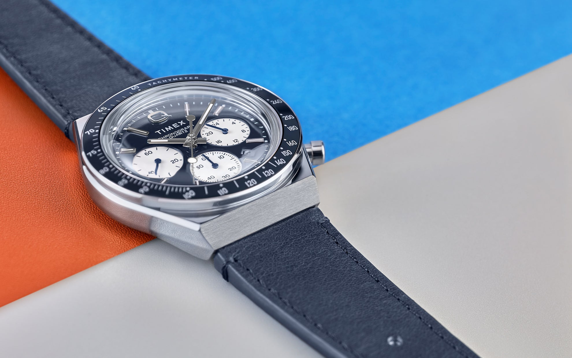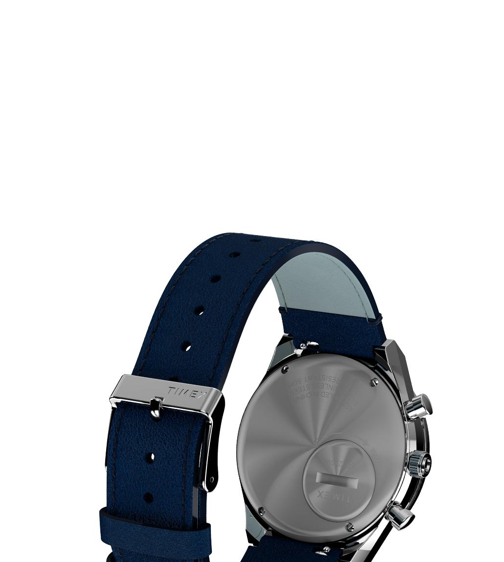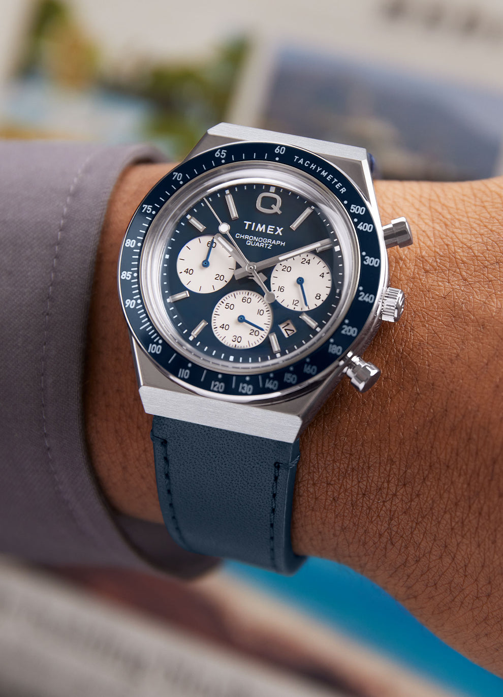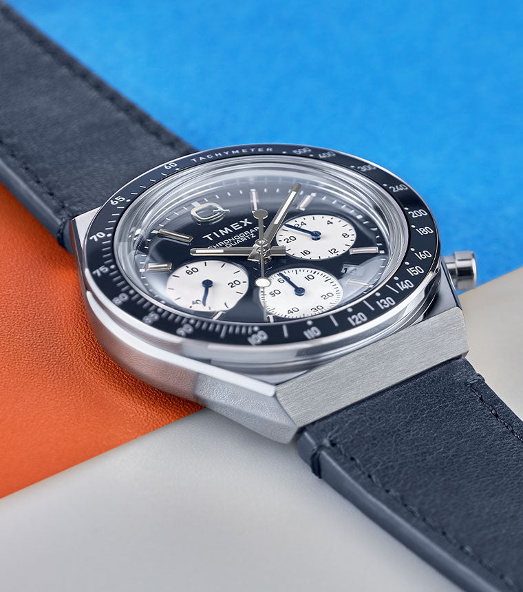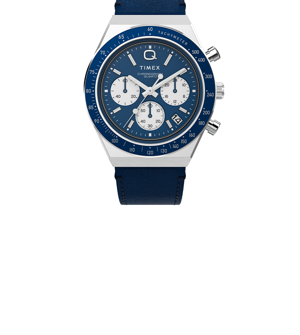 Roar across the finish line with our high-performing Q Timex® Chronograph. Inspired by the original motoring watches that graced the tracks of Europe’s most iconic races, this timepiece celebrates the endurance of our legendary 1970s Q Timex. An ultra-precise chronograph movement and tachymeter bezel recreate the finesse and function of a true racing watch, allowing you to determine elapsed time and average speed like the greatest daredevils in motorsports. Contrasting sub-dials, a date feature, hand-applied dimensional indices, and an updated Q Timex logo stand beautifully against a midnight dial, while a stainless-steel crown and brushed and polished 40mm stainless-steel case bring dynamism and durability to its retro construction. Infinitely wearable, it presents with a midnight natural leather strap sourced from the Leather Working Group® (LWG).