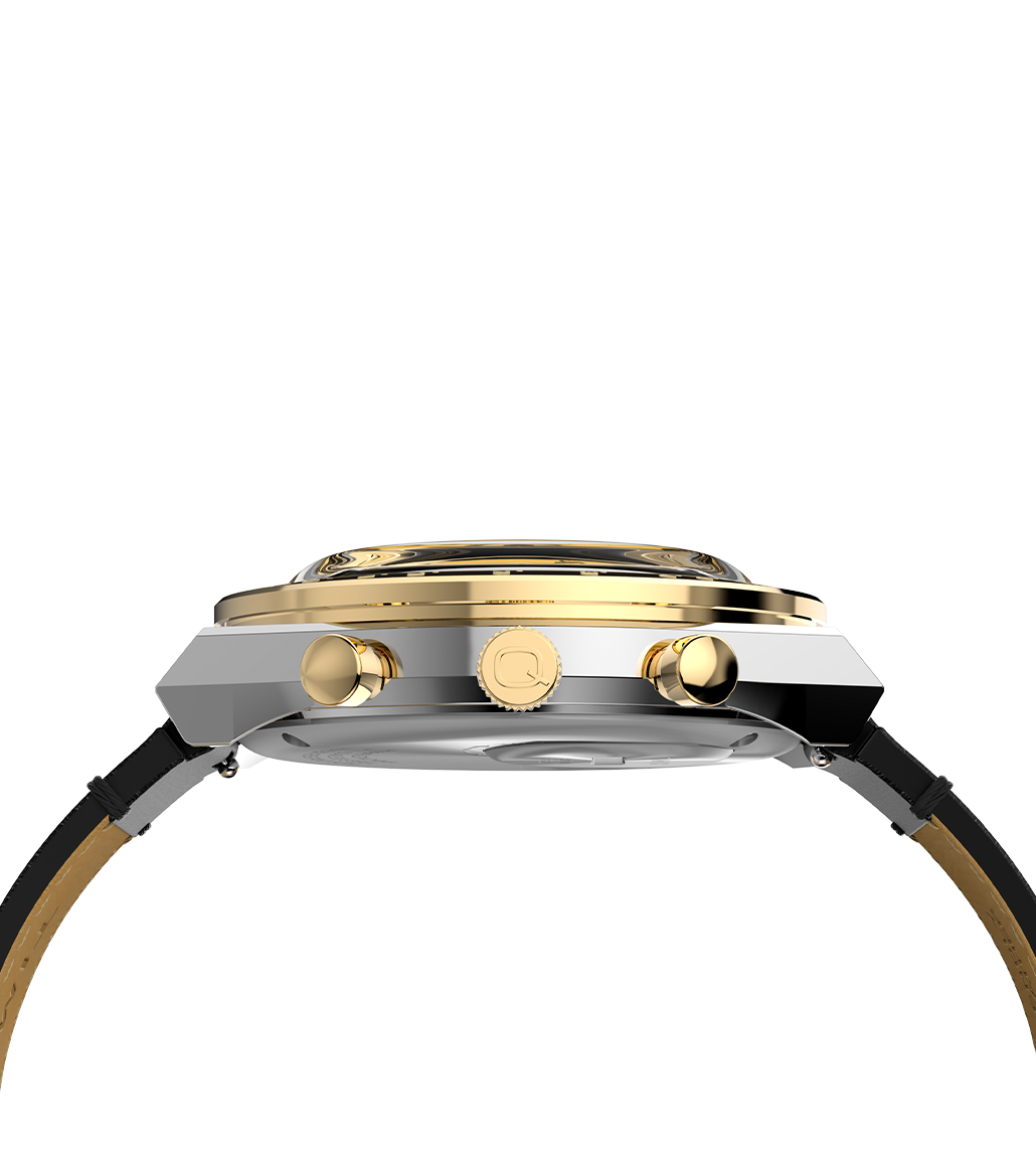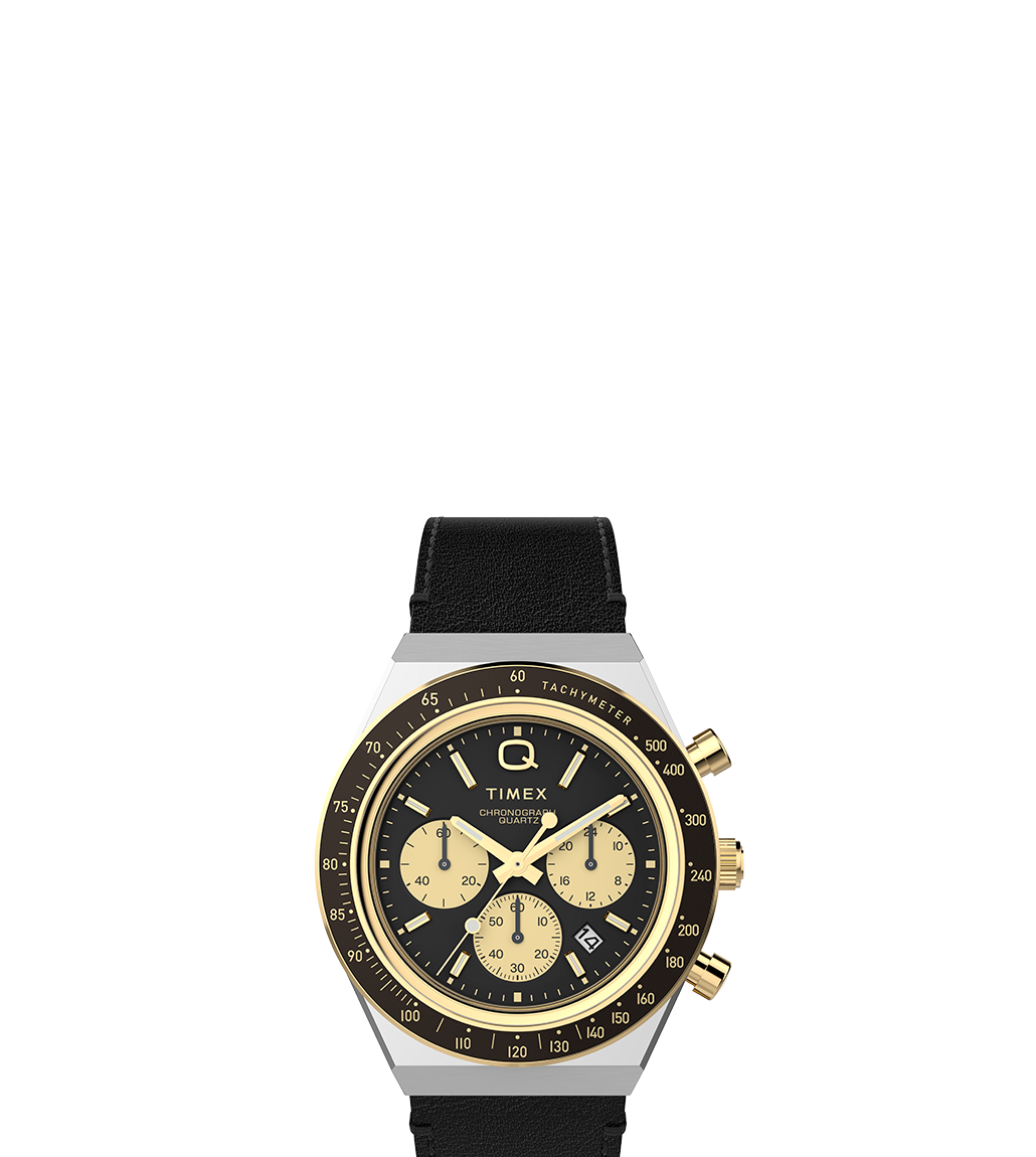 Roar across the finish line with our high-performing Q Timex Chronograph. Inspired by the original motoring watches that graced the tracks of Europe’s most iconic races, this timepiece celebrates the endurance of our legendary 1970s Q Timex. An ultra-precise chronograph movement and black tachymeter bezel recreate the finesse and function of a true racing watch, allowing you to determine elapsed time and average speed like the greatest daredevils in motorsports. Contrasting sub-dials, a date feature, hand-applied dimensional indices, and a Q Timex logo smolder against a jet-black dial, while a recycled stainless-steel case and crown bring dynamism and durability to its retro construction. Infinitely wearable, it offers a domed acrylic crystal, quick release spring bars, and an eco-friendly natural leather strap sourced from the Leather Working Group (LWG) and complete with quick-re...