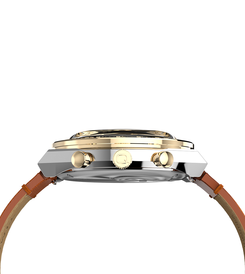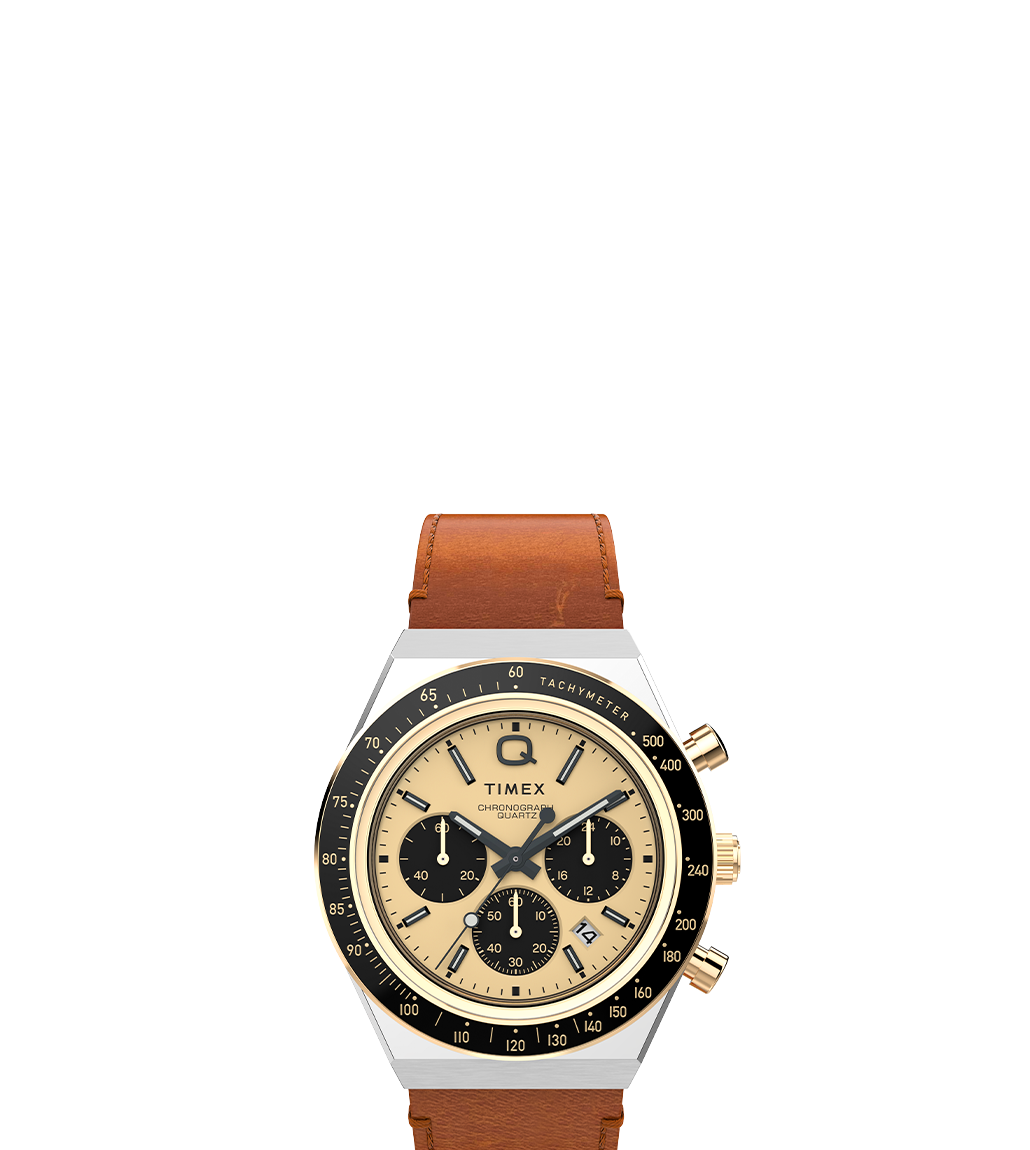 Roar across the finish line with our high-performing Q Timex Chronograph. Inspired by the original motoring watches that graced the tracks of Europe’s most iconic races, this timepiece celebrates the endurance of our legendary 1970s Q Timex. An ultra-precise chronograph movement and black tachymeter bezel recreate the finesse and function of a true racing watch, allowing you to determine elapsed time and average speed like the greatest daredevils in motorsports. Contrasting sub-dials, a date feature, hand-applied dimensional indices, and a Q Timex logo smolder against a deep gold-tone dial, while a recycled stainless-steel case and crown bring dynamism and durability to its retro construction. Infinitely wearable, it offers a domed acrylic crystal, quick release spring bars, and an eco-friendly natural leather strap sourced from the Leather Working Group (LWG) and complete with qui...
