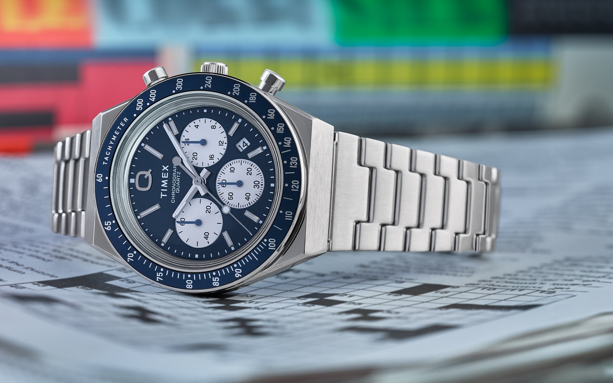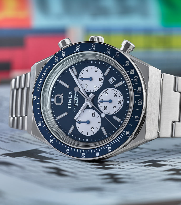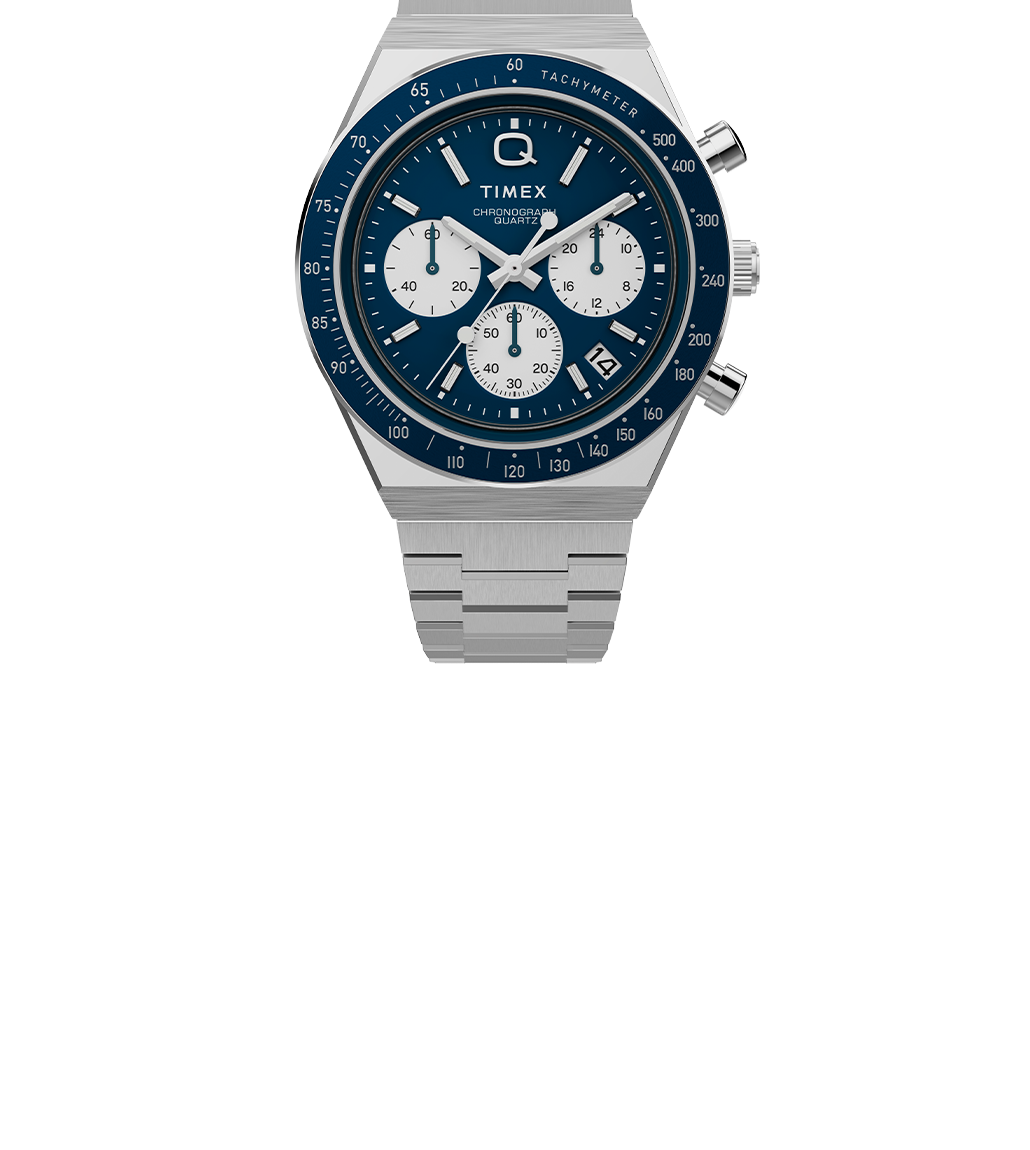 Roar across the finish line with our high-performing Q Timex® Chronograph. Inspired by the original motoring watches that graced the tracks of Europe’s most iconic races, this timepiece celebrates the endurance of our legendary 1970s Q Timex. An ultra-precise chronograph movement and tachymeter bezel recreate the finesse and function of a true racing watch, allowing you to determine elapsed time and average speed like the greatest daredevils in motorsports. Contrasting sub-dials, a date feature, hand-applied dimensional indices, and an updated Q Timex logo stand beautifully against a midnight dial, while a stainless-steel crown and brushed and polished 40mm stainless-steel case bring dynamism and durability to its retro construction. Infinitely wearable, it presents with a sleek stainless-steel bracelet.