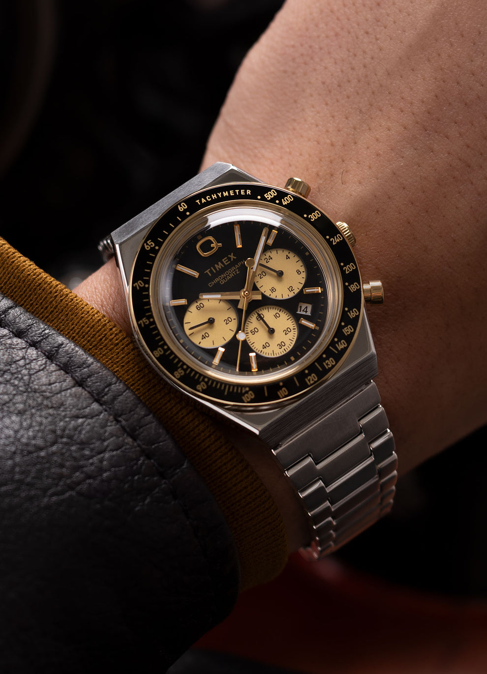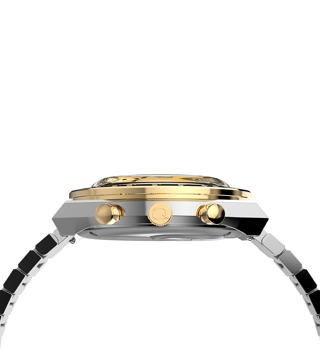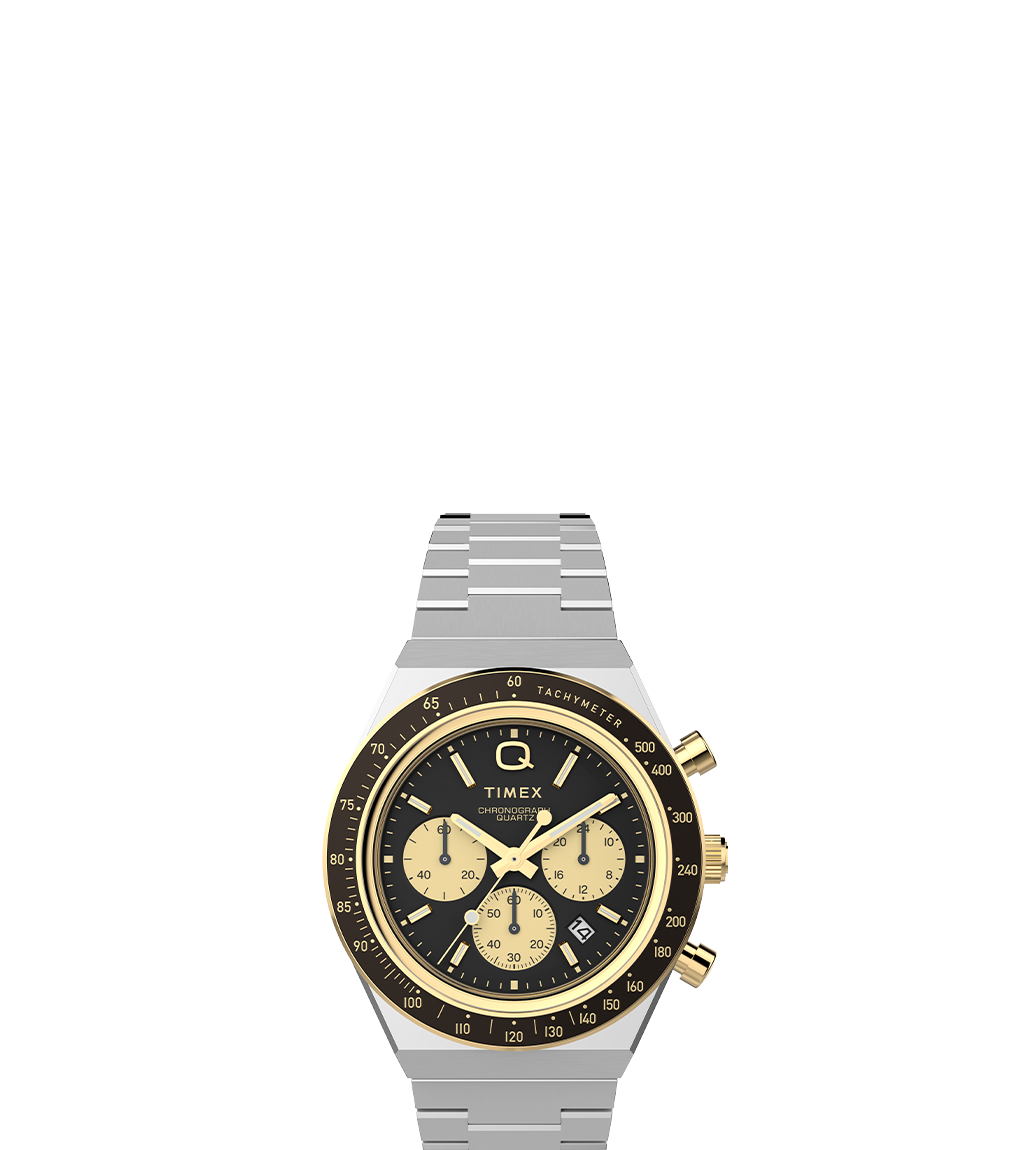 Roar across the finish line with our high-performing Q Timex Chronograph. Inspired by the original motoring watches that graced the tracks of Europe’s most iconic races, this timepiece celebrates the endurance of our legendary 1970s Q Timex. An ultra-precise chronograph movement and black tachymeter bezel recreate the finesse and function of a true racing watch, allowing you to determine elapsed time and average speed like the greatest daredevils in motorsports. Contrasting sub-dials, a date feature, hand-applied dimensional indices, and a Q Timex logo smolder against a jet-black dial, while a recycled stainless-steel case and crown bring dynamism and durability to its retro construction. Infinitely wearable, it offers a domed acrylic crystal, quick release spring bars, and a recycled stainless-steel bracelet complete with quick-release spring bars for a smooth presentation that’s ...