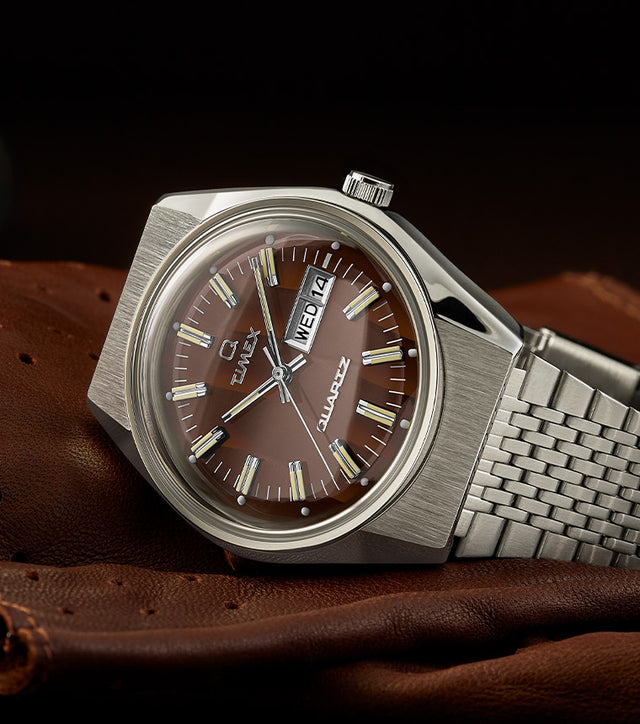 Following on the heels of our Q Timex 1979 reissue, our Q Timex Falcon Eye adds refinement to our Q Timex series. Reissued for today, we recreated every detail – a period-correct woven stainless-steel bracelet, stainless-steel case, luminescent hands, dimensional indices, and a striking chocolate brown Côtes de Genève dial. The result is a refined watch retaining every ounce of soul and character from the era that inspired it.Specifications