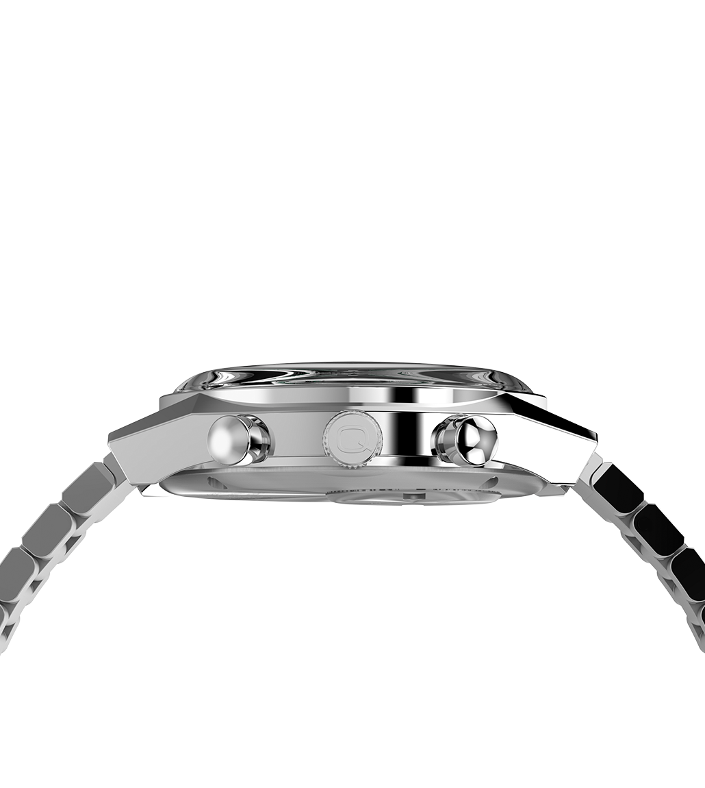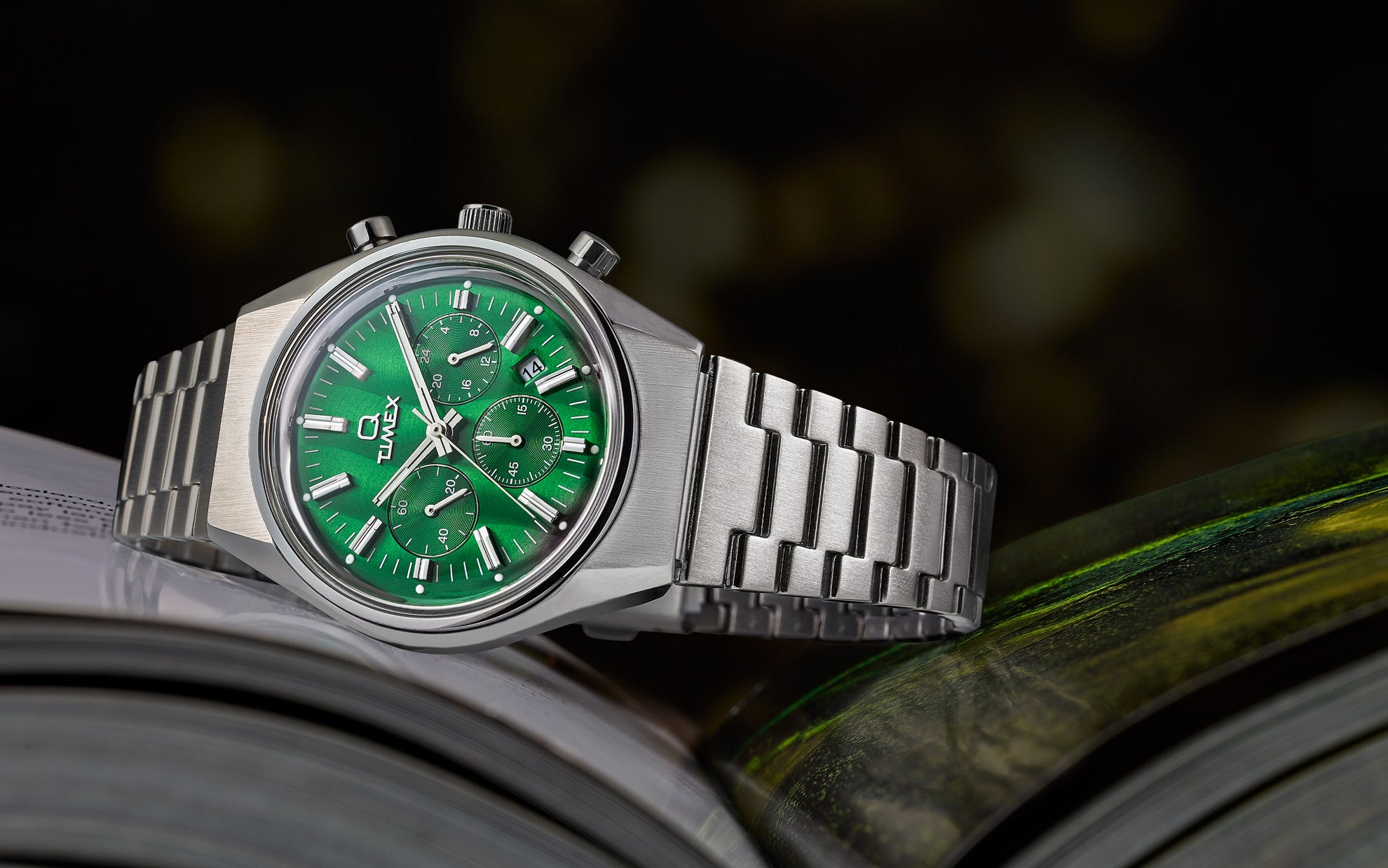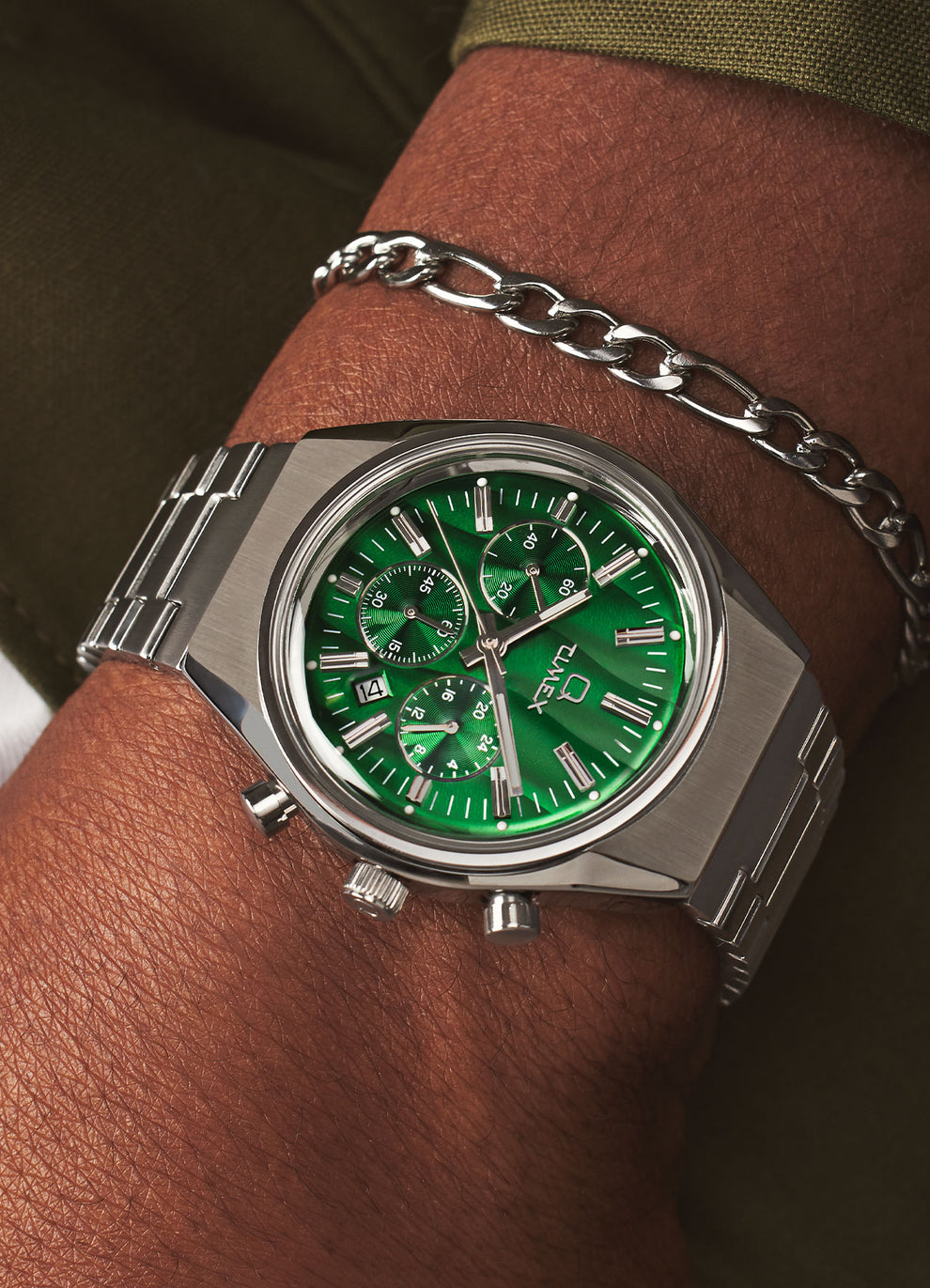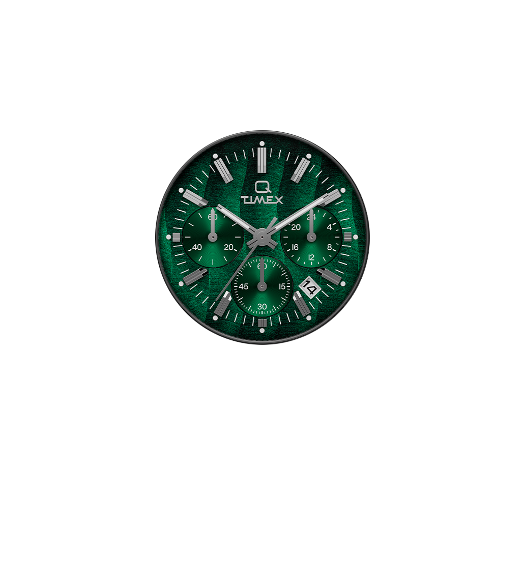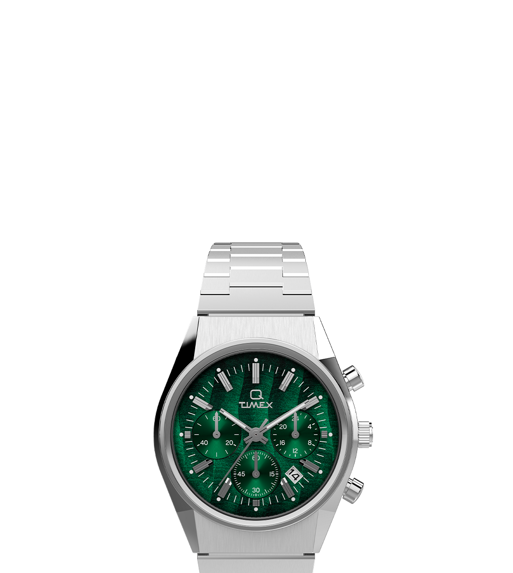 Following on the heels of our Q Timex 1979 Reissue, the Falcon Eye pays homage to its predecessor by mirroring some of the most quintessential details that you already know and love—a period-correct 40mm stainless-steel case and coordinating 3-link stainless-steel bracelet, dimensional applied indices, a domed acrylic crystal, and a date window. We’ve updated this refined timepiece with a chronograph movement for tracking elapsed time, but at the end of the day, it’s the striking green Côtes de Genève dial that steals the show, flashing a unique wave of texture with your every movement.