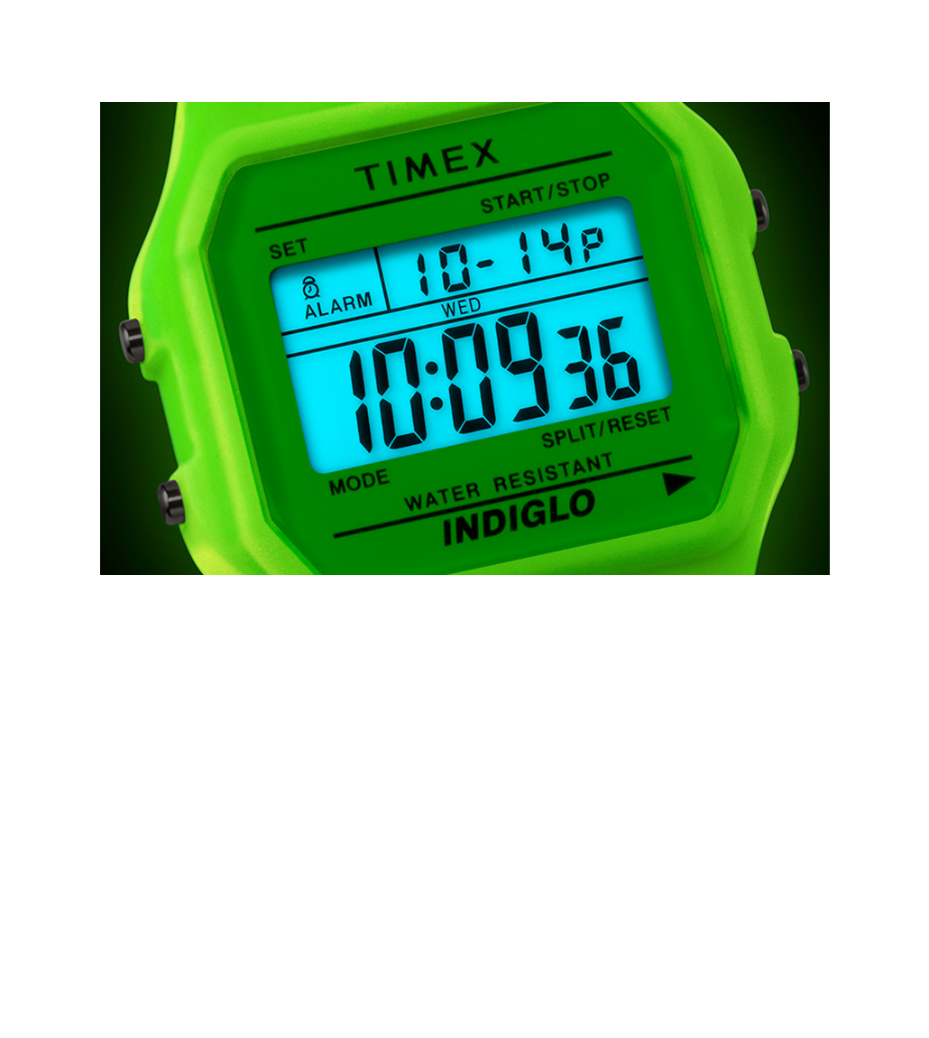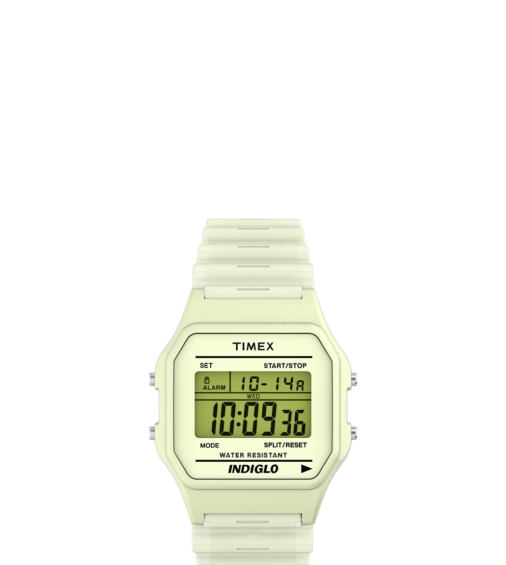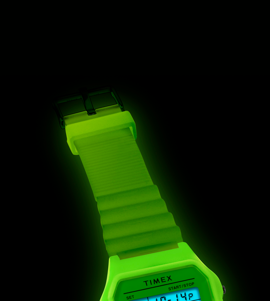 Our T80 is a throwback to the decade that gave us big hair, big music, and big dreams. It also pays homage to our original digital watches, some of the first to hit the market. To honor those early hits, we’re proudly reintroducing the T80 to a whole new generation—a watch that’s both a stylish accessory and a serious timekeeping device. Featuring a new resin case and strap that glow in the dark, this fun retro design includes a date display, stopwatch, alarm, and our revolutionary INDIGLO® backlight.