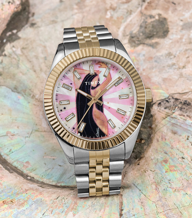 The Timex Legacy x Jacquie Aiche Musings collection inspires you to make time for what sparks the light within so that your true essence can shine. The dial showcases a divinely feminine mosaic, with a pink background pieced together using shimmering mother-of-pearl that glistens with your every movement. Illuminate your wrist stack with its ethereal glow and keep on shining.Specifications