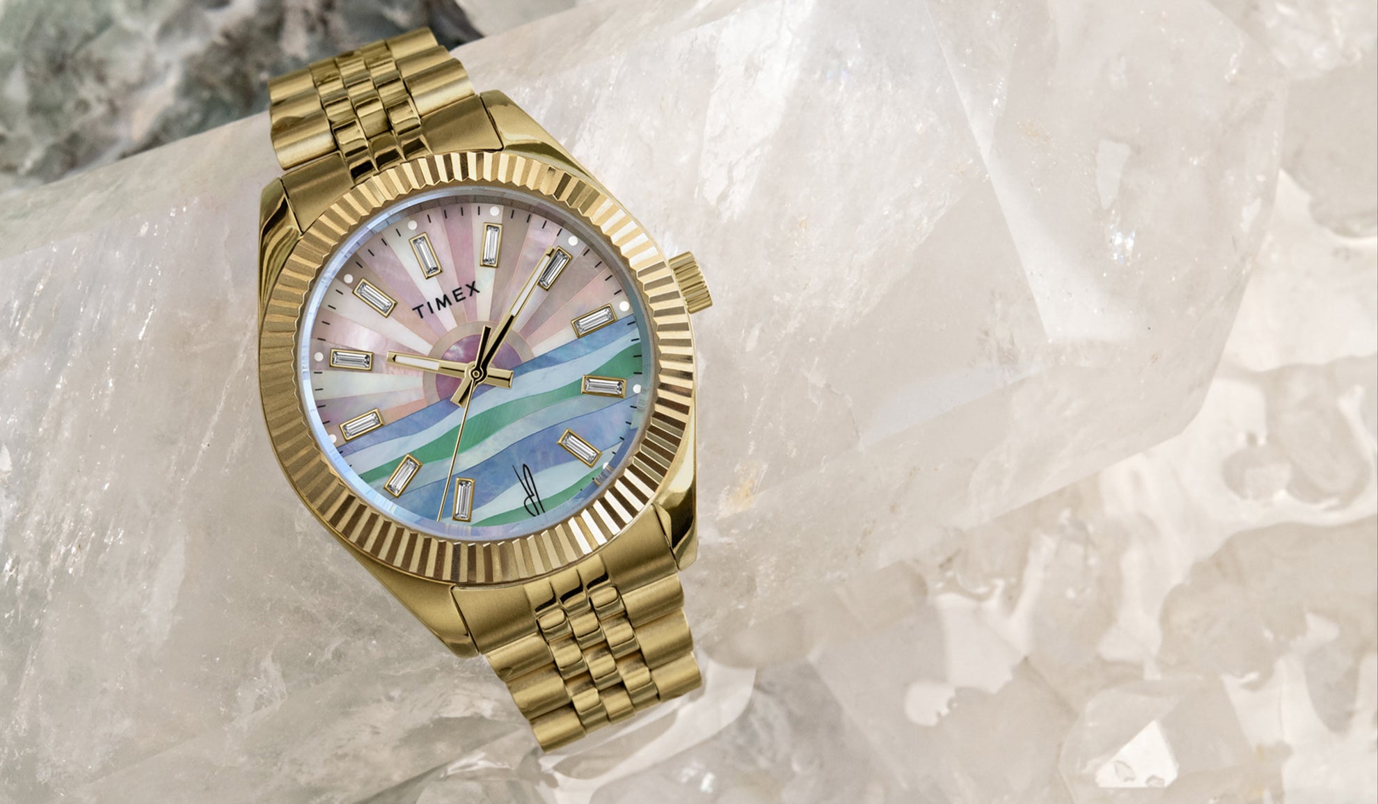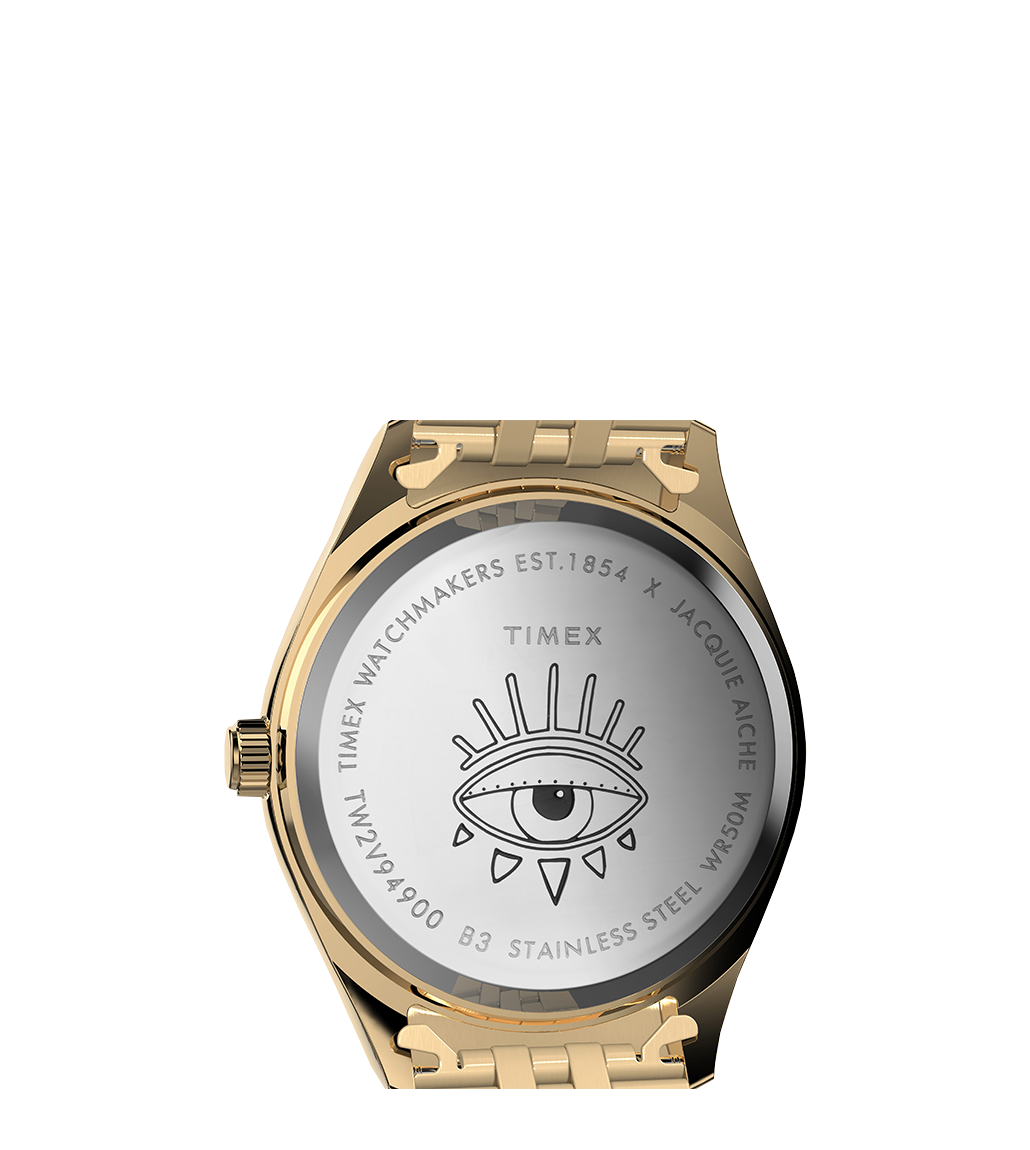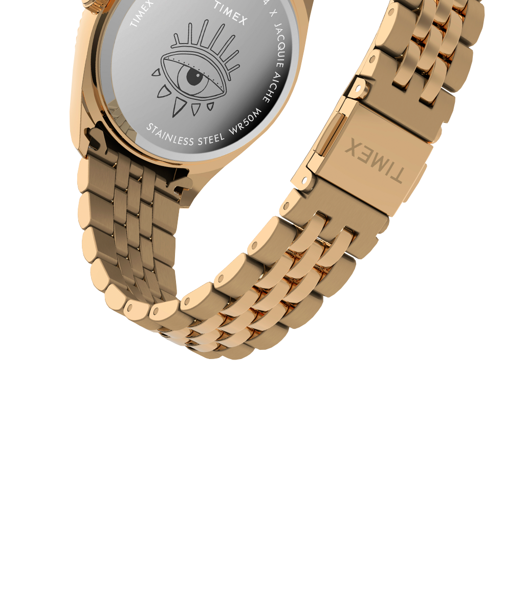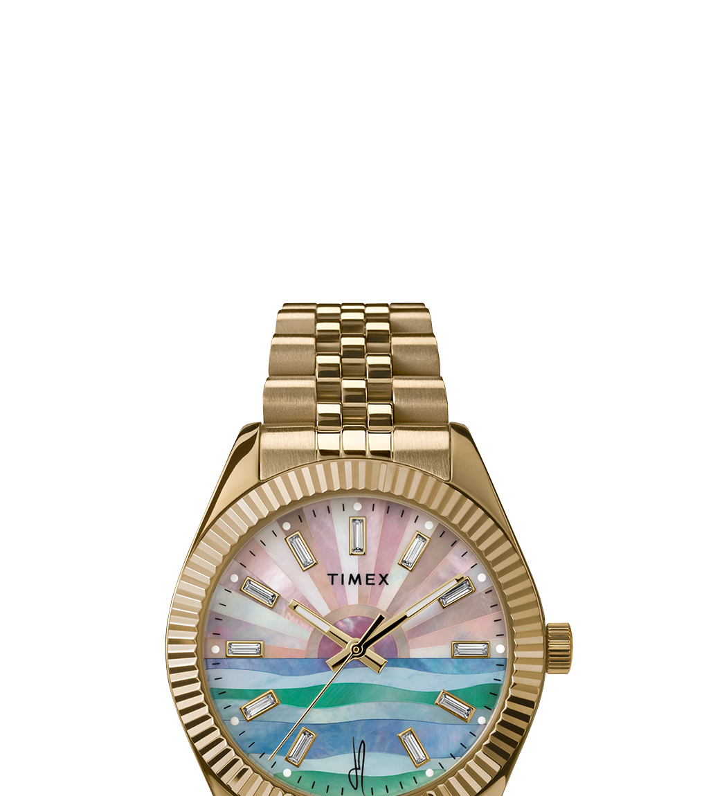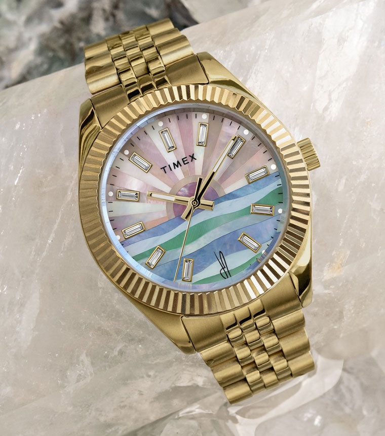 The Timex Legacy x Jacquie Aiche Sunrise is inspired by the bliss and beauty found in new beginnings. The dial showcases a captivating mosaic of celestial rays rising above the ocean, pieced together using multi-colored mother-of-pearl that glistens with your every movement. Illuminate your wrist stack with its golden glow and keep on shining.