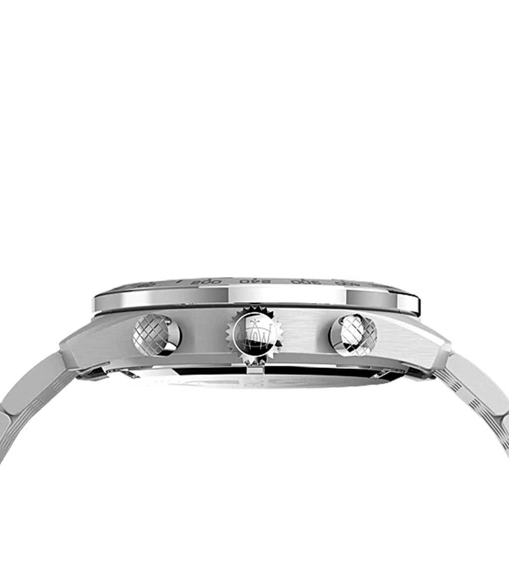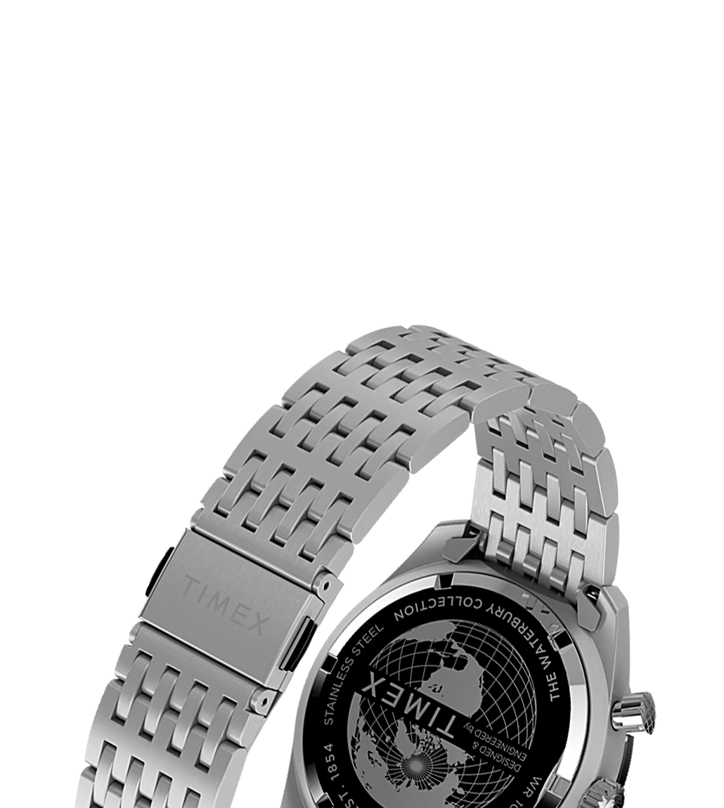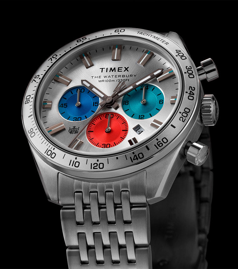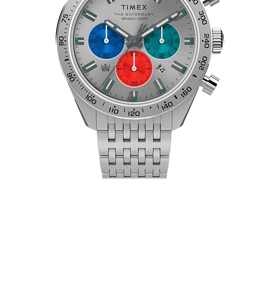 We’ve blended our favorite elements of the Waterbury case design to welcome a new quartz member into the family. Like all Waterbury’s, this timepiece displays our attention to craftsmanship and detail with finely finished surfaces and careful applications of watchmaking ingenuity. In a nod to our original collection, The Waterbury Watch Company logo is featured on the dial and second hand, which bears the stylized W, while the chronograph, featuring a tachymeter top ring has been added to the existing case design. We’ve topped things off with a sophisticated dial, multi-colored sub-dials, and stainless-steel bracelet that deliver function just as well as form.
