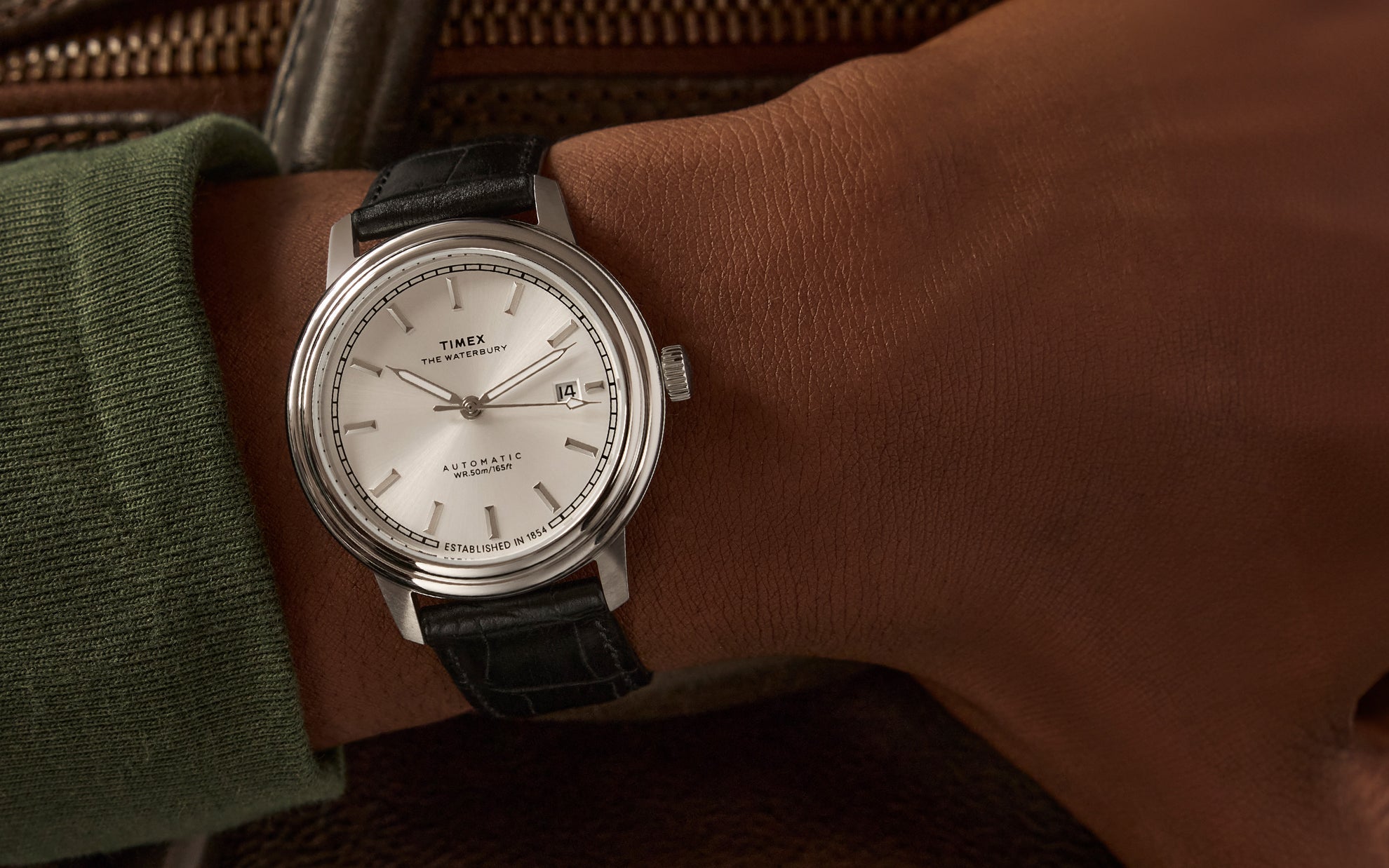 Defined by sharp lines and sweeping curves, the Waterbury Automatic features an enhanced 41mm stainless-steel case with an elegant two-tiered bezel. Encircling the silver-white dial are beveled markers and a rail track, paired with a sleek handset and a date window sitting beside the third hour marker. This sophisticated timepiece is paired with a black natural leather strap ethically sourced from the Leather Working Group (LWG), complete with an enticing crocodile grain and a deployant clasp.