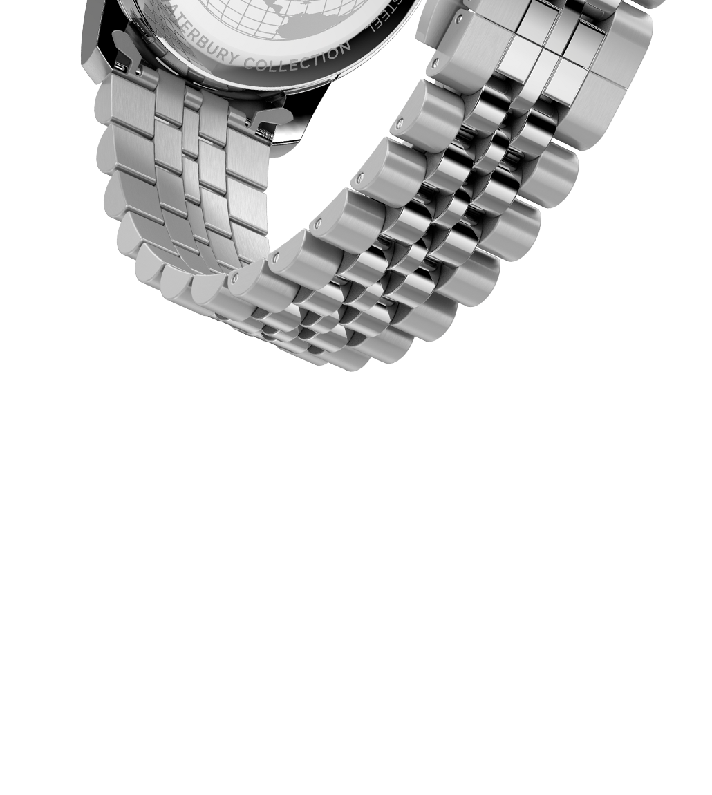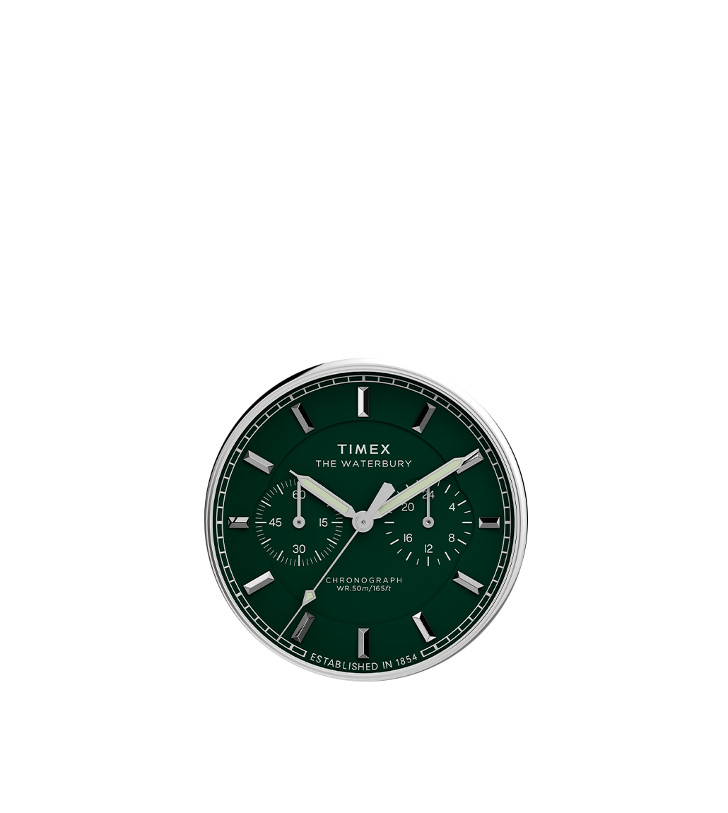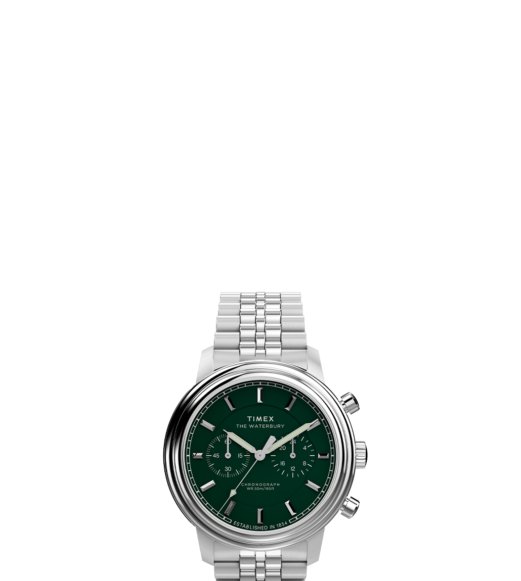 Defined by sharp lines and sweeping curves, the Waterbury Metropolitan features an enhanced 41mm stainless-steel case with an elegant two-tiered bezel. Encircling the green dial are beveled markers and a rail track, paired with a sleek handset. This sophisticated timepiece is equipped with a two sub-dial chronograph movement for tracking elapsed time and is offered with a stainless-steel bracelet with a butterfly clasp.