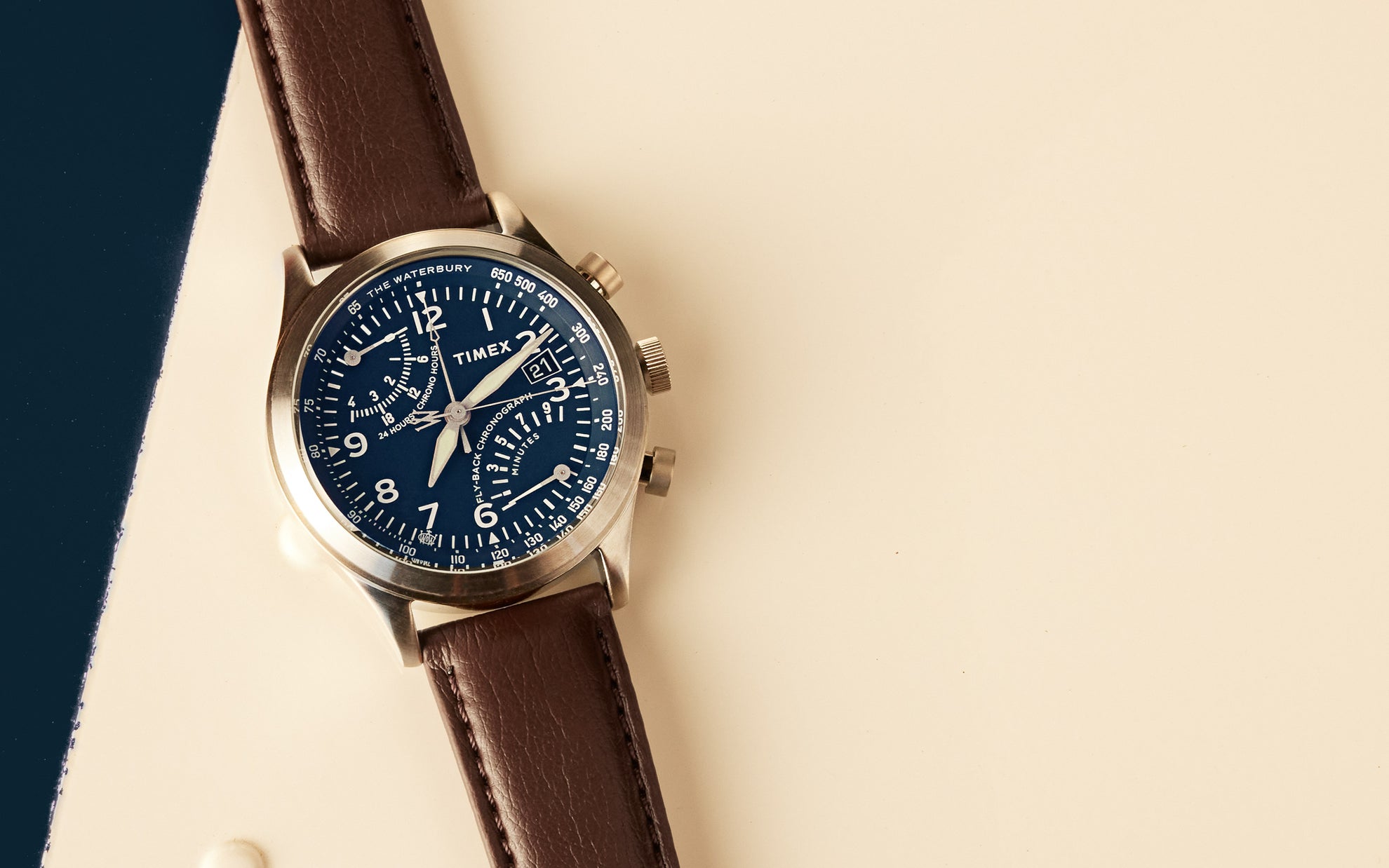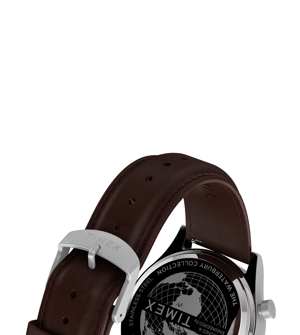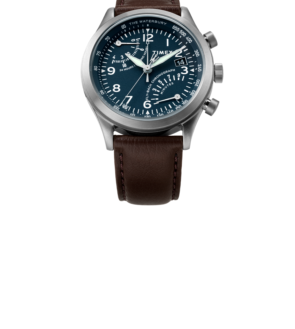 Built with our proprietary fly-back chronograph movement designed in Pforzheim, Germany, the dial of our Waterbury Traditional Fly-Back Chronograph houses fan-shaped sub-dials at the 4 o'clock and 10 o'clock positions with retrograde hands. A single press of the fly back pusher instantly resets the chronograph to display the current time in the current lap without the need to stop and reset, and when the chronograph isn’t in use, the upper sub-dial doubles as a second time zone indicator. This watch boasts a robust 43mm stainless-steel case paired with a cruelty-free vegan leather strap. Other notable details include a date window positioned at 2:30, luminous hour and minute hands for enhanced visibility, 100m of water resistance, and the iconic stylized W of the Waterbury Watch Company logo displayed on the crown, sweep second hand, and beside the 7th hour marker.
