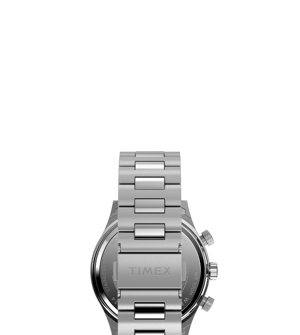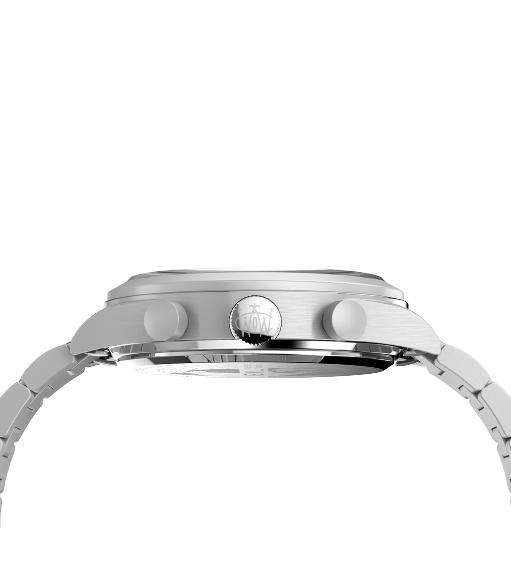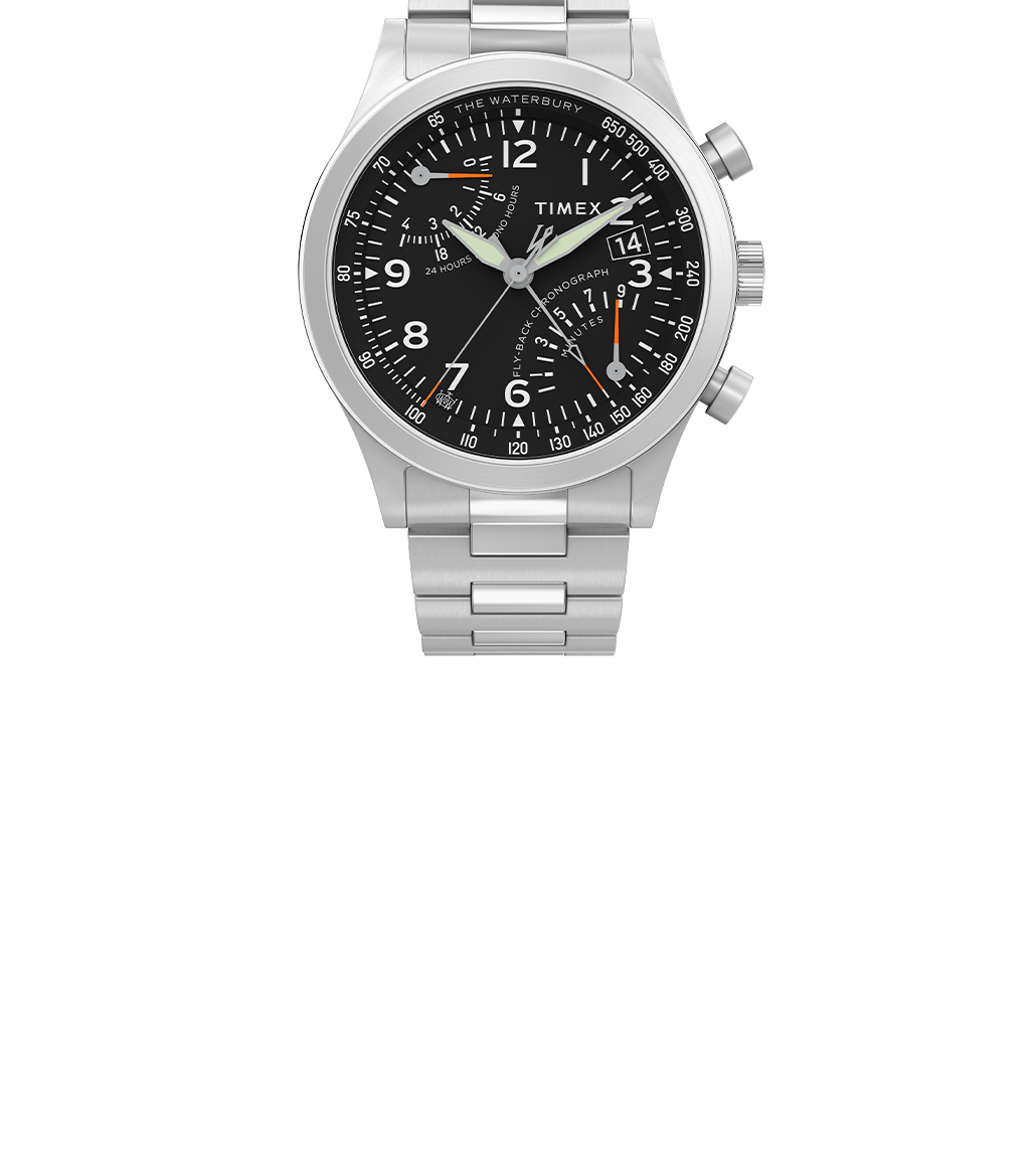 Built with our proprietary fly-back chronograph movement designed in Pforzheim, Germany, the dial of our Waterbury Traditional Fly-Back Chronograph houses fan-shaped sub-dials at the 4 o'clock and 10 o'clock positions with retrograde hands. A single press of the fly back pusher instantly resets the chronograph to display the current time in the current lap without the need to stop and reset, and when the chronograph isn’t in use, the upper sub-dial doubles as a second time zone indicator. This watch boasts a robust 43mm stainless-steel case paired with an adjustable stainless-steel bracelet. Other notable details include a date window positioned at 2:30, luminous hour and minute hands for enhanced visibility, 100m of water resistance, and the iconic stylized W of the Waterbury Watch Company logo displayed on the crown, sweep second hand, and beside the 7th hour marker.